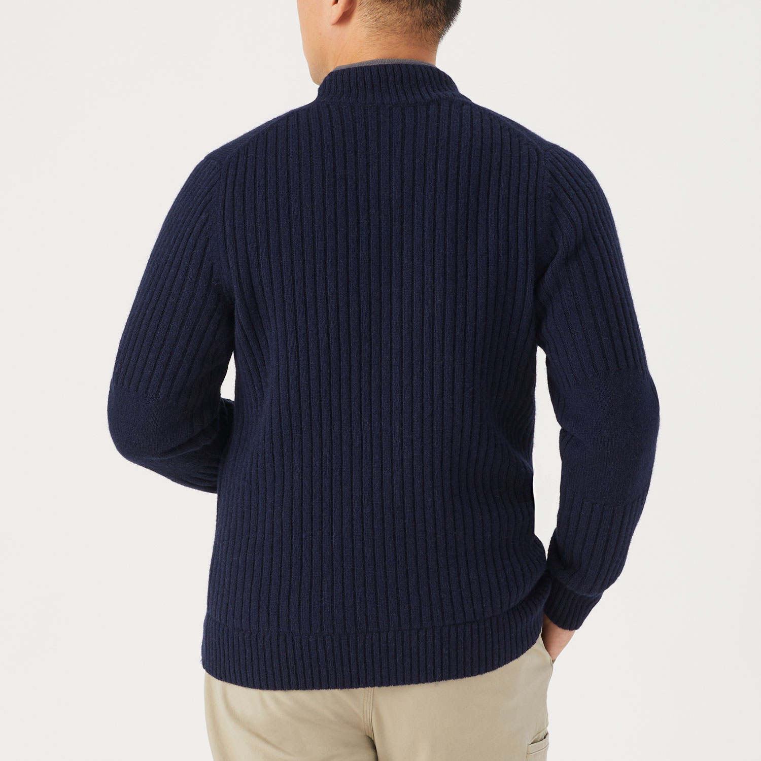 - Bold 3x2 rib knit with contrasting texture at the shoulders and elbows – classy!