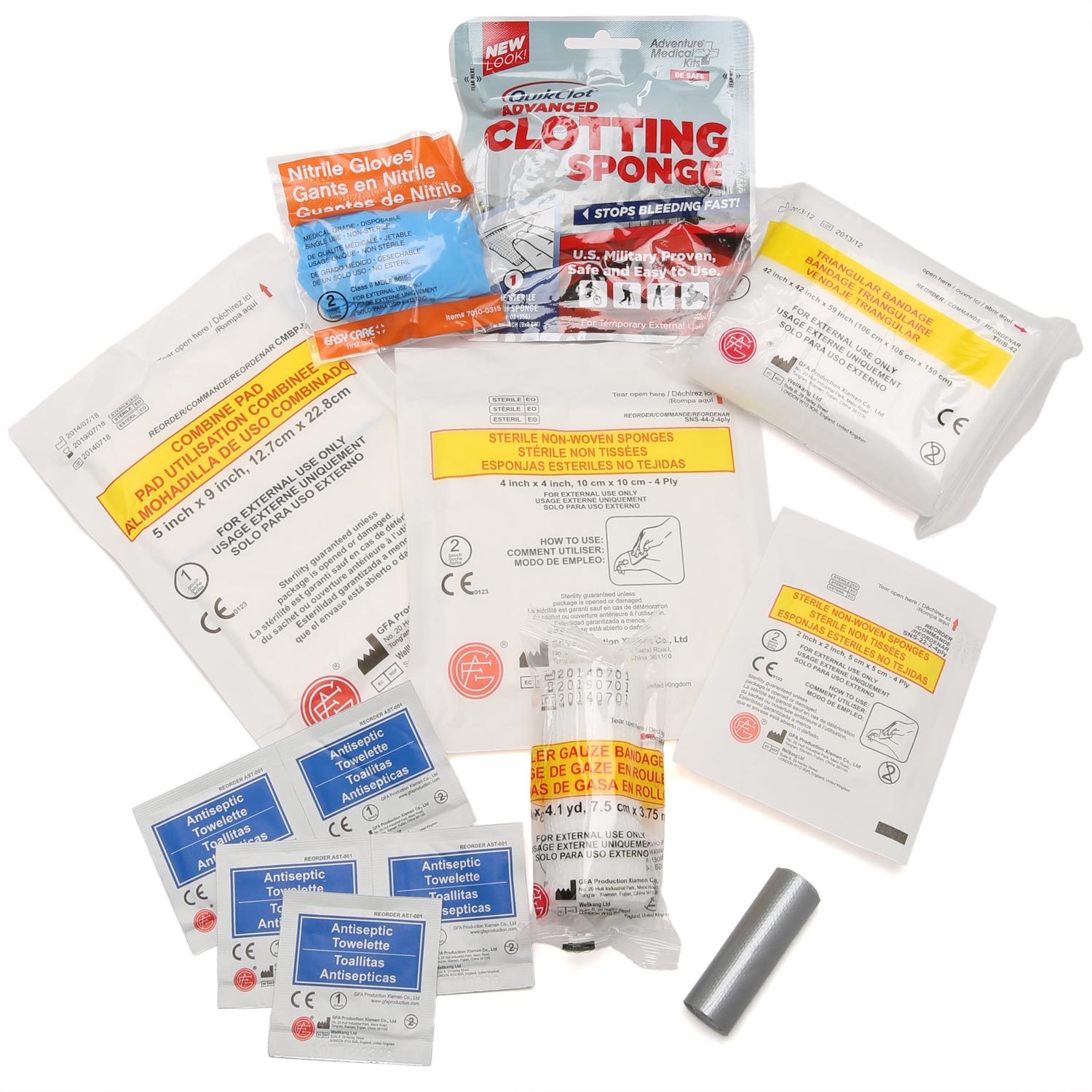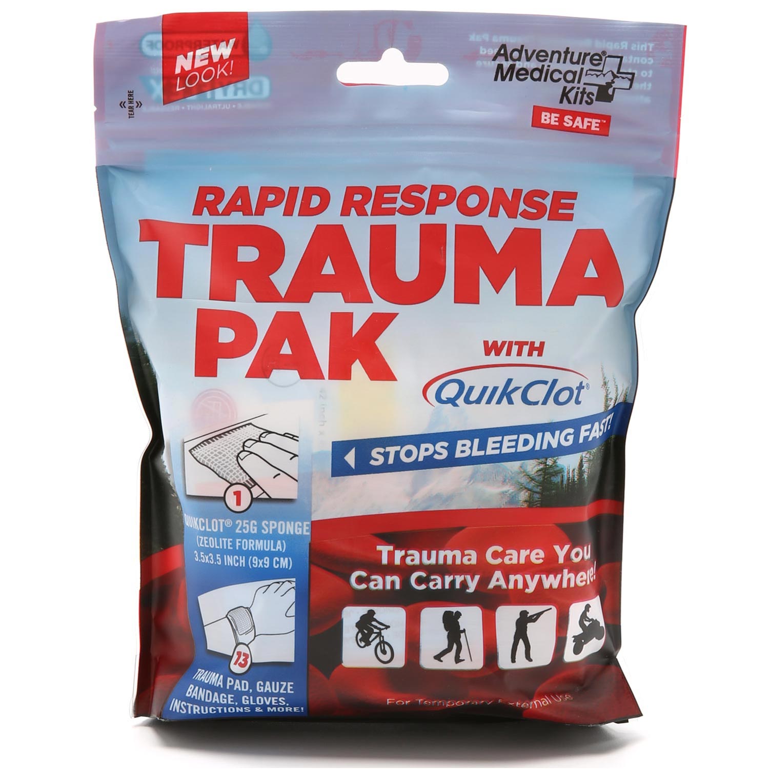 - Includes QuikClot sponge to rapidly stop heavy bleeding