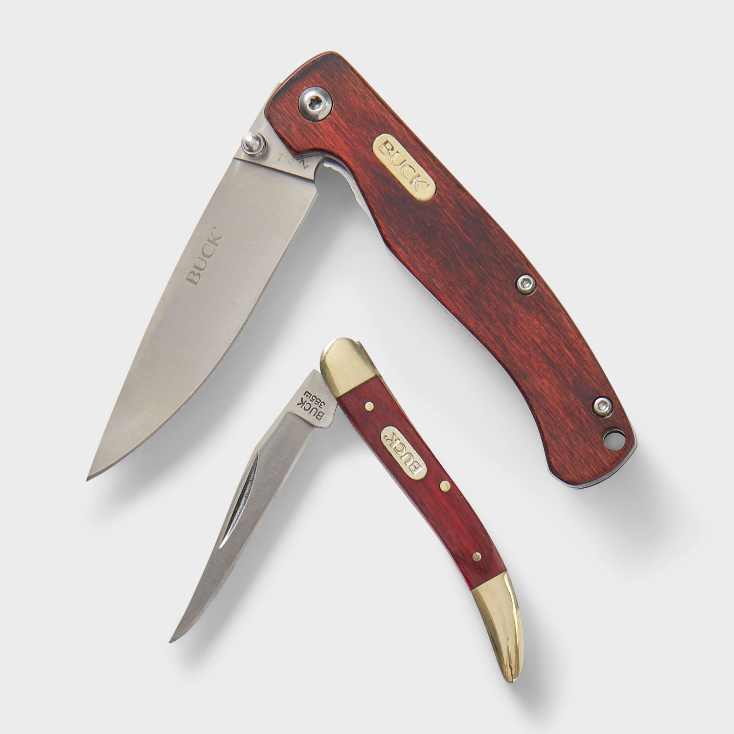 In 1964, fueled by faith and determination, Al Buck launched a fledgling business that has produced what many regard as the finest knives ever made. Now your favorite fellow can own not one, but two precision-crafted Buck® folders sure to achieve EDC status. The smaller is a classic “toothpick” knife, named for the long, narrow clip blade designed for detailed cutting – ideal for disappearing into a dress or casual pants pocket. The larger knife is a muscular liner lock folder equipped with a thumb stud for quick one-handed opening. Its 2-7/8" 7Cr17 steel drop point blade has excellent strength, edge retention and corrosion resistance. Both knives feature rich-looking handle scales of pakkawood, an engineered material with the natural look of wood grain, but with superior durability and water resistance. The pair arrive in a handsome Duluth tin, ready to impress the heck out of your giftee.