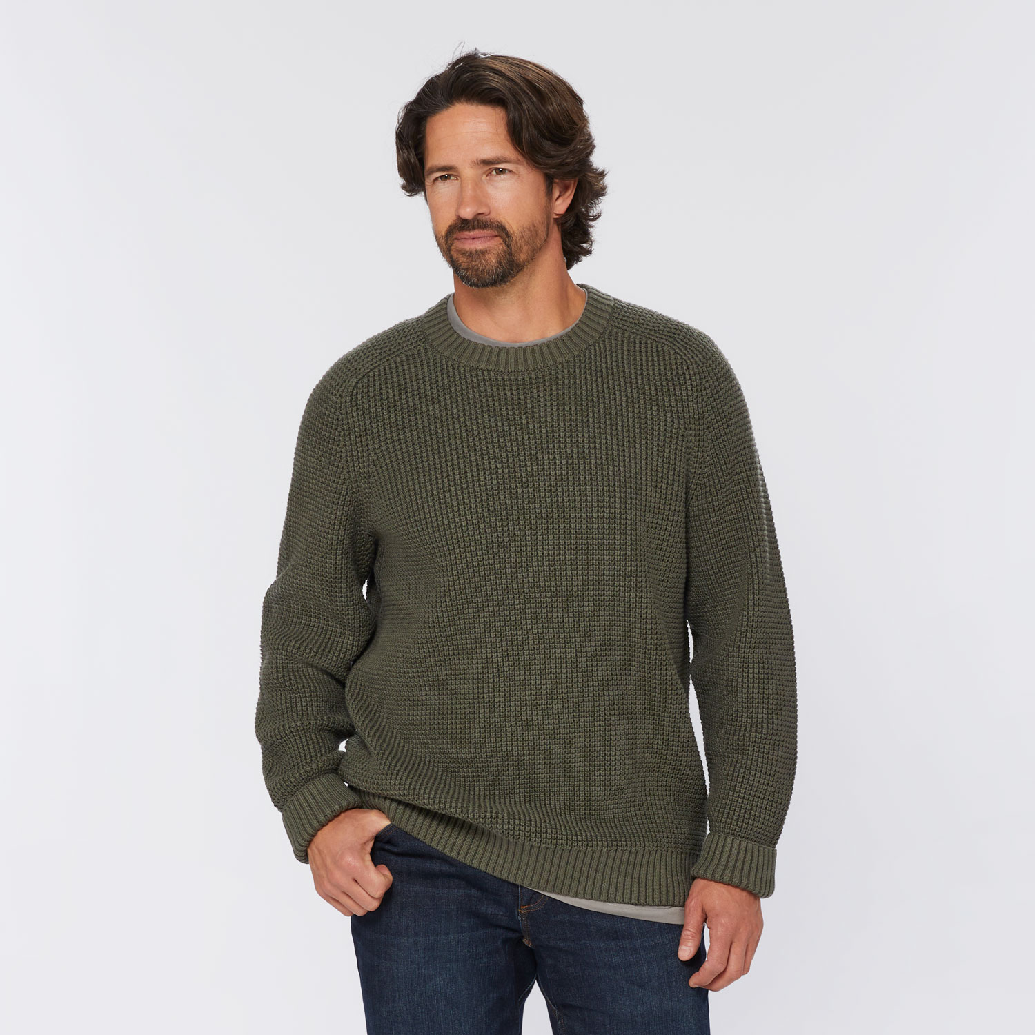 Even though you’re still punching the clock, you don’t have to wait to feel like you’re on easy street. Slip on this hefty crew and you can retire “burly” right now – to your favorite easy chair to relax in the effortless warmth of the heavy-gauge cotton-rich waffle knit. Layer it over a turtleneck or tee at home, or slip it on over a Wrinklefighter woven shirt when you’re dressing to impress. Ribbed neck, bottom band and cuffs with spandex keep this sweater in shape no matter how active you are – or aren’t. Reach Gussets® give you ample room to deal a hand of poker or grab the TV remote. And if you actually are retired, what are you waiting for? Go ahead and order one up – you’ve earned it!