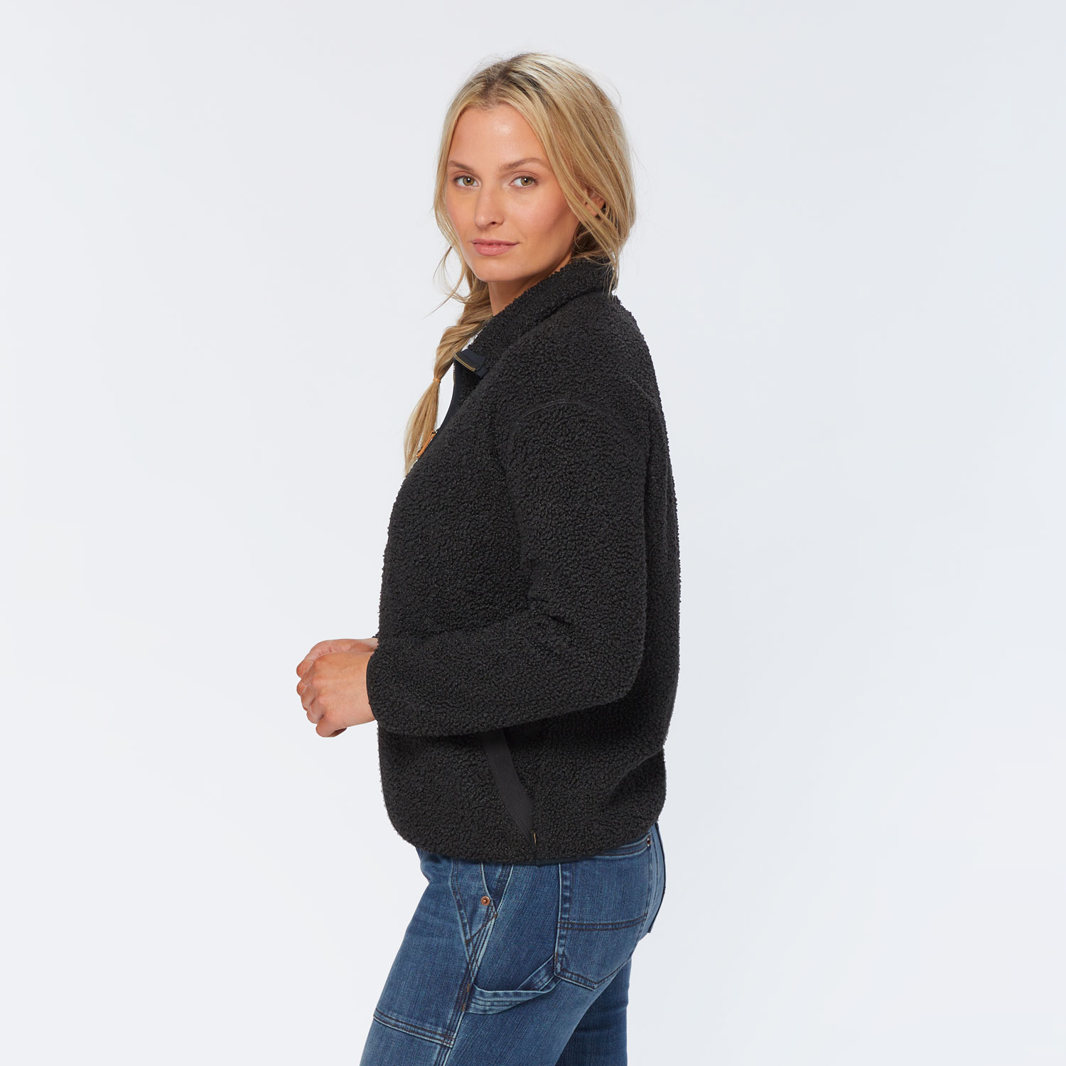 Fluffy boucle fleece is soft and substantial – just the thing to huddle up in when you’re out and about. This quarter-zip pullover’s gentle drape cradles your curves, but edge binding keeps the silhouette clean and sleek. Zip up the high collar to seal brisk winds out and warm hands in the ample kangaroo pocket (psst – inside you’ll find a hidden phone pouch, too). This woolly wonder feels just like snuggling with a newborn lamb (given, way less smelly and sooo much easier to maintain). It’s the layer you won’t want to put down all winter!