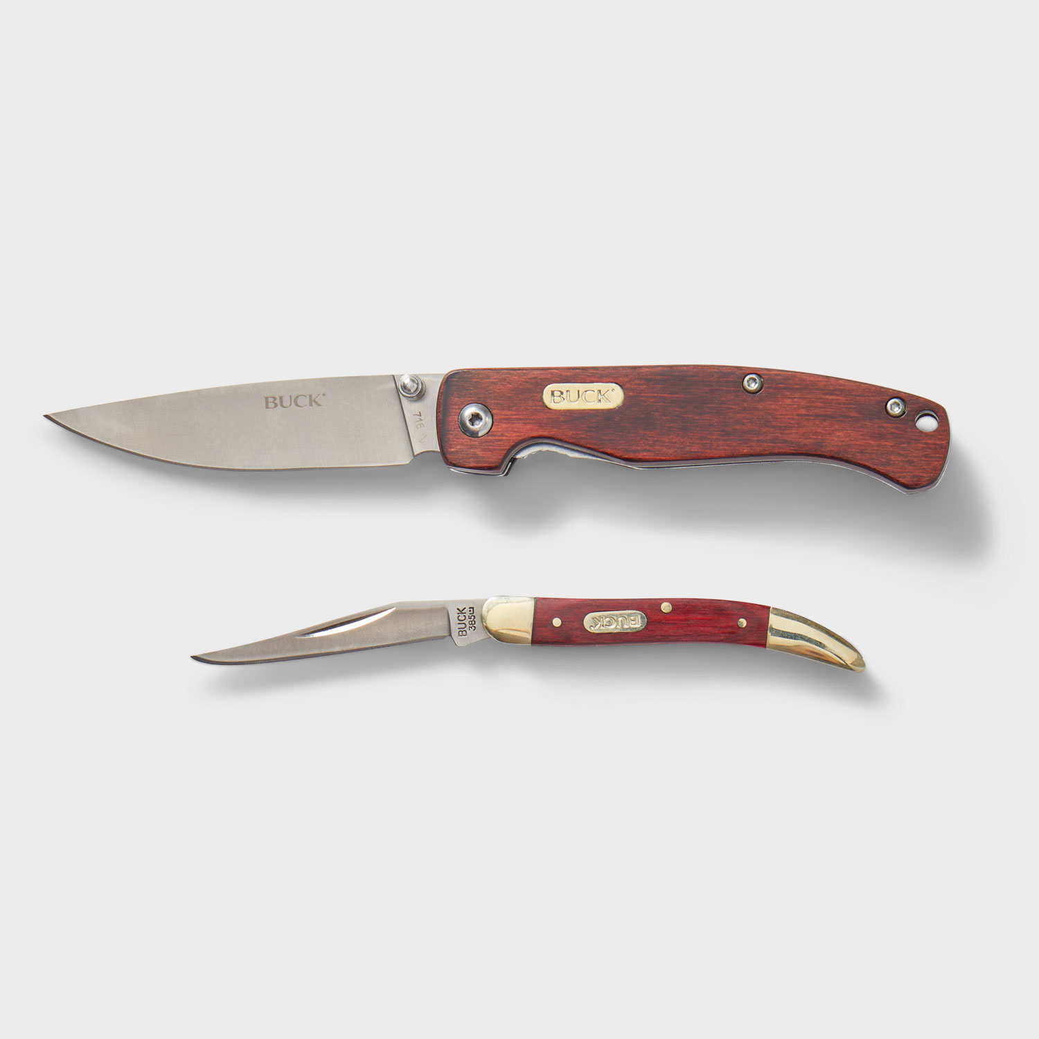 In 1964, fueled by faith and determination, Al Buck launched a fledgling business that has produced what many regard as the finest knives ever made. Now your favorite fellow can own not one, but two precision-crafted Buck® folders sure to achieve EDC status. The smaller is a classic “toothpick” knife, named for the long, narrow clip blade designed for detailed cutting – ideal for disappearing into a dress or casual pants pocket. The larger knife is a muscular liner lock folder equipped with a thumb stud for quick one-handed opening. Its 2-7/8" 7Cr17 steel drop point blade has excellent strength, edge retention and corrosion resistance. Both knives feature rich-looking handle scales of pakkawood, an engineered material with the natural look of wood grain, but with superior durability and water resistance. The pair arrive in a handsome Duluth tin, ready to impress the heck out of your giftee.