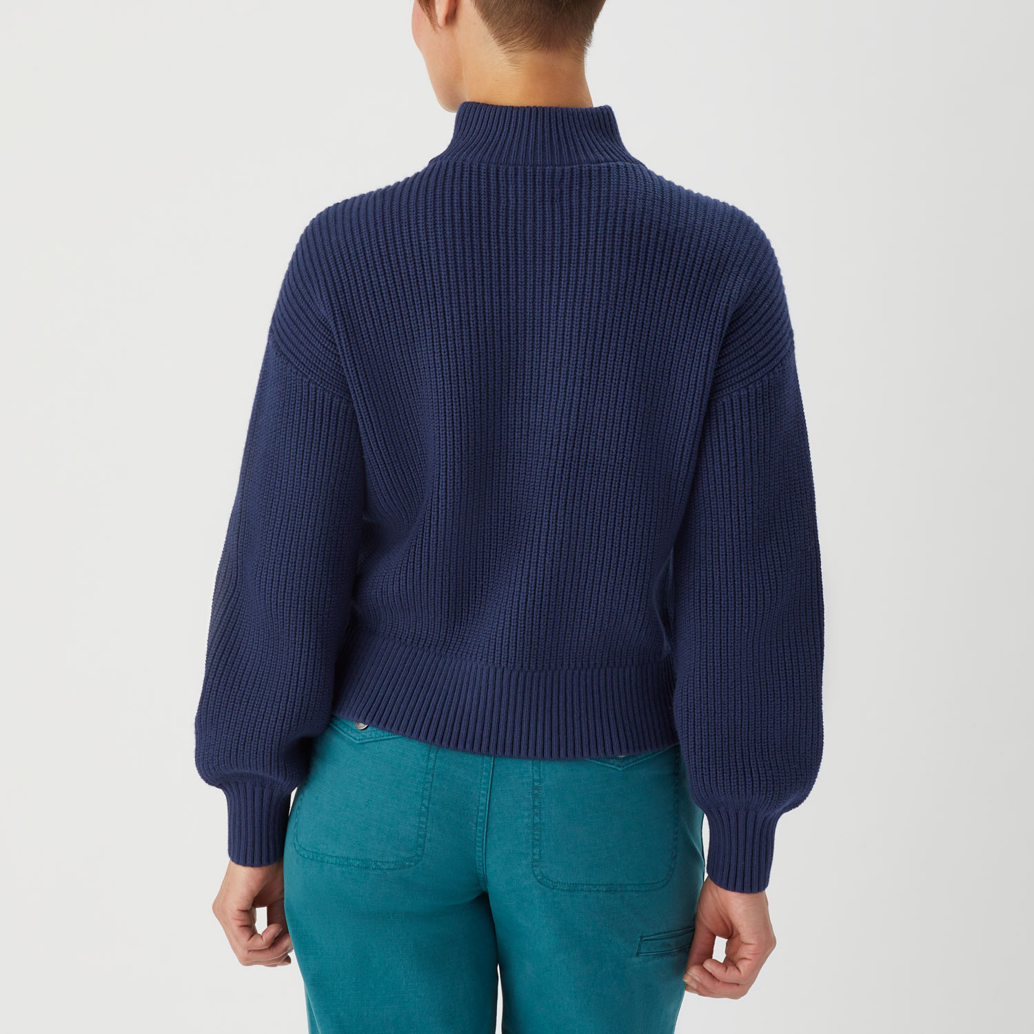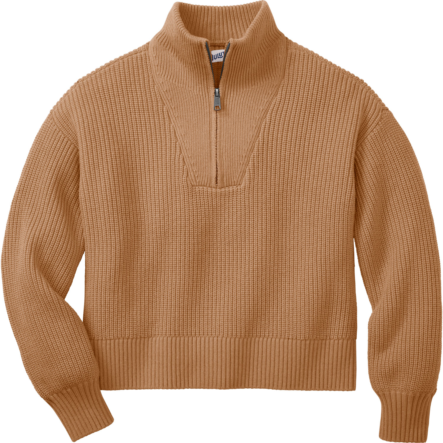 - Quarter-zip neck with 1x1 rib collar stands at attention
