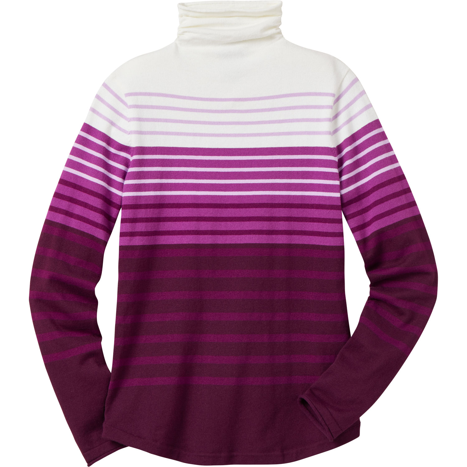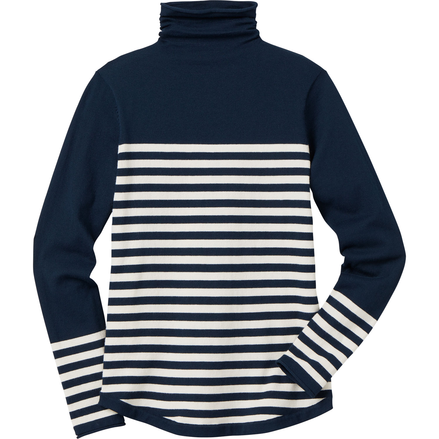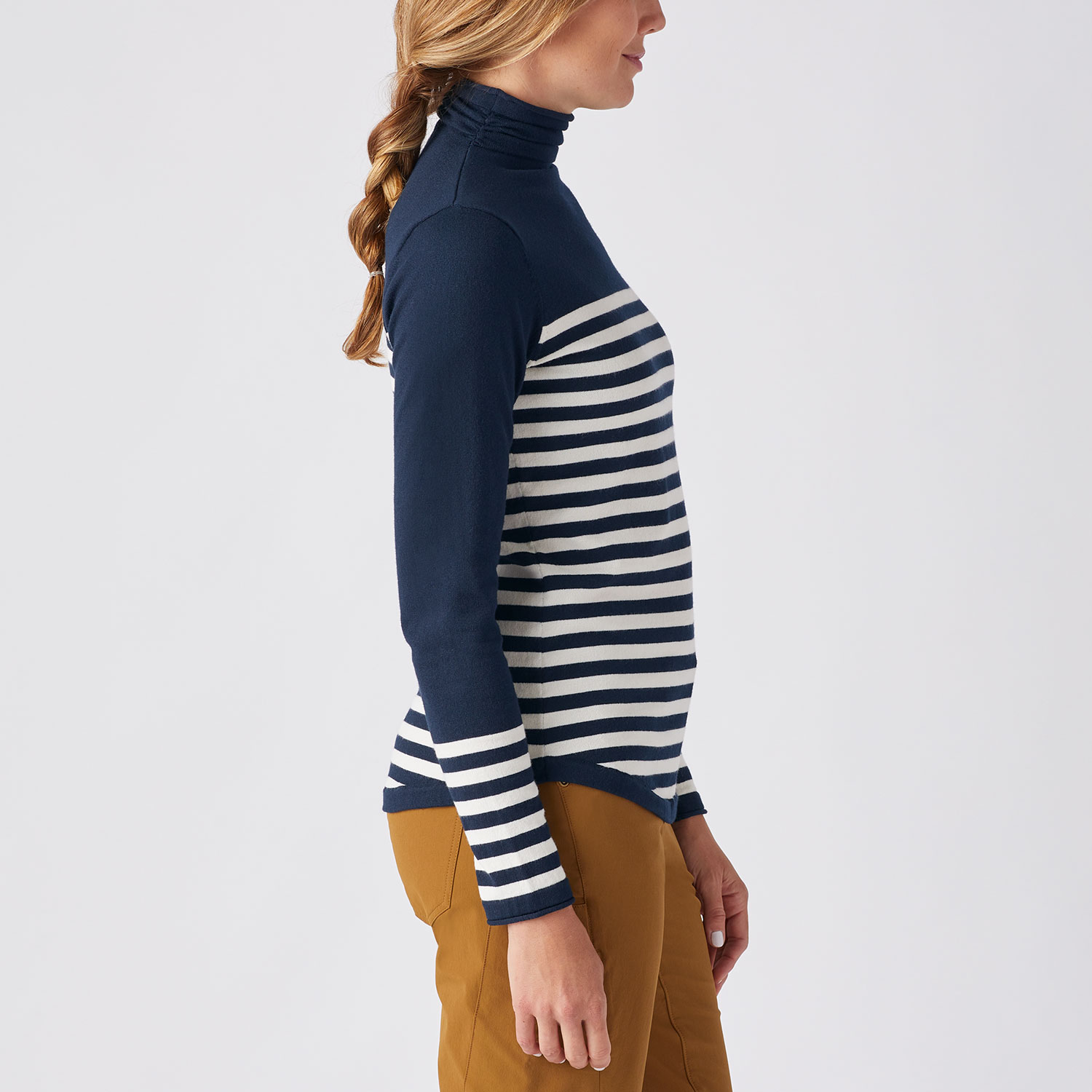 - Gathered turtleneck offers chin-deep coziness without constricting