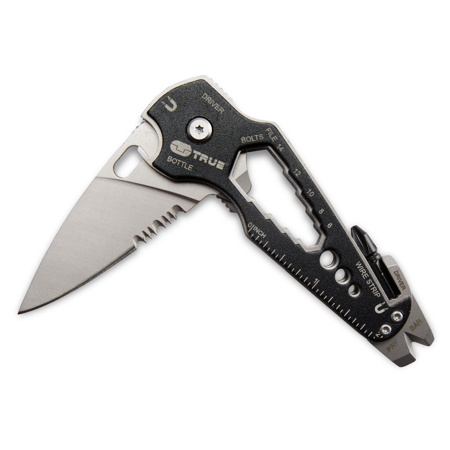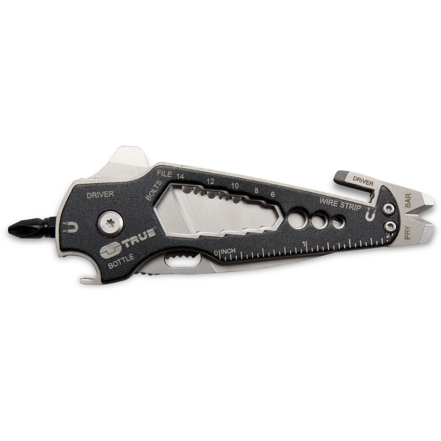 - Includes pry bar, bottle opener, screwdrivers, wire stripper, rulers, file, five metric wrenches and 1/4” magnetic bit storage