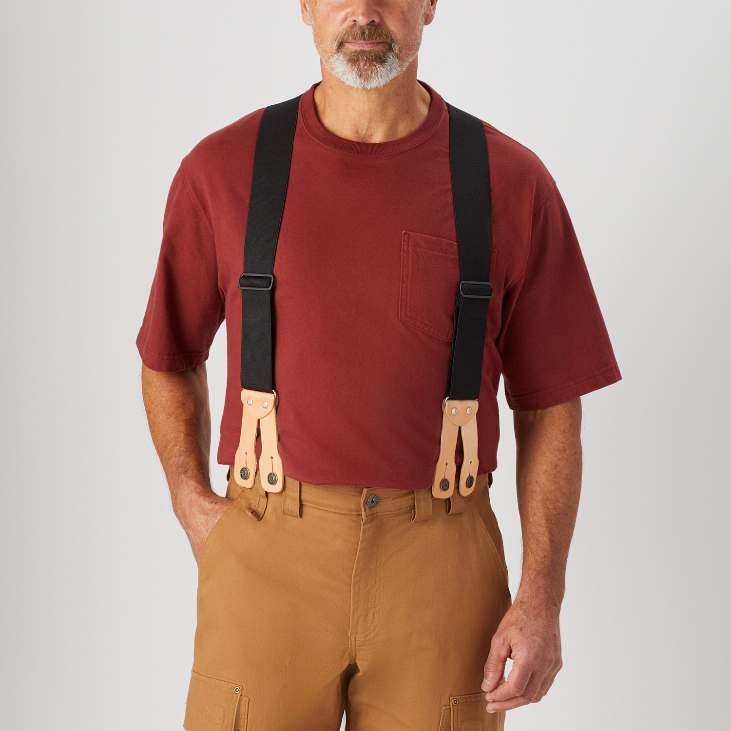 - Rugged leather button clasps attach to buttons on your pants