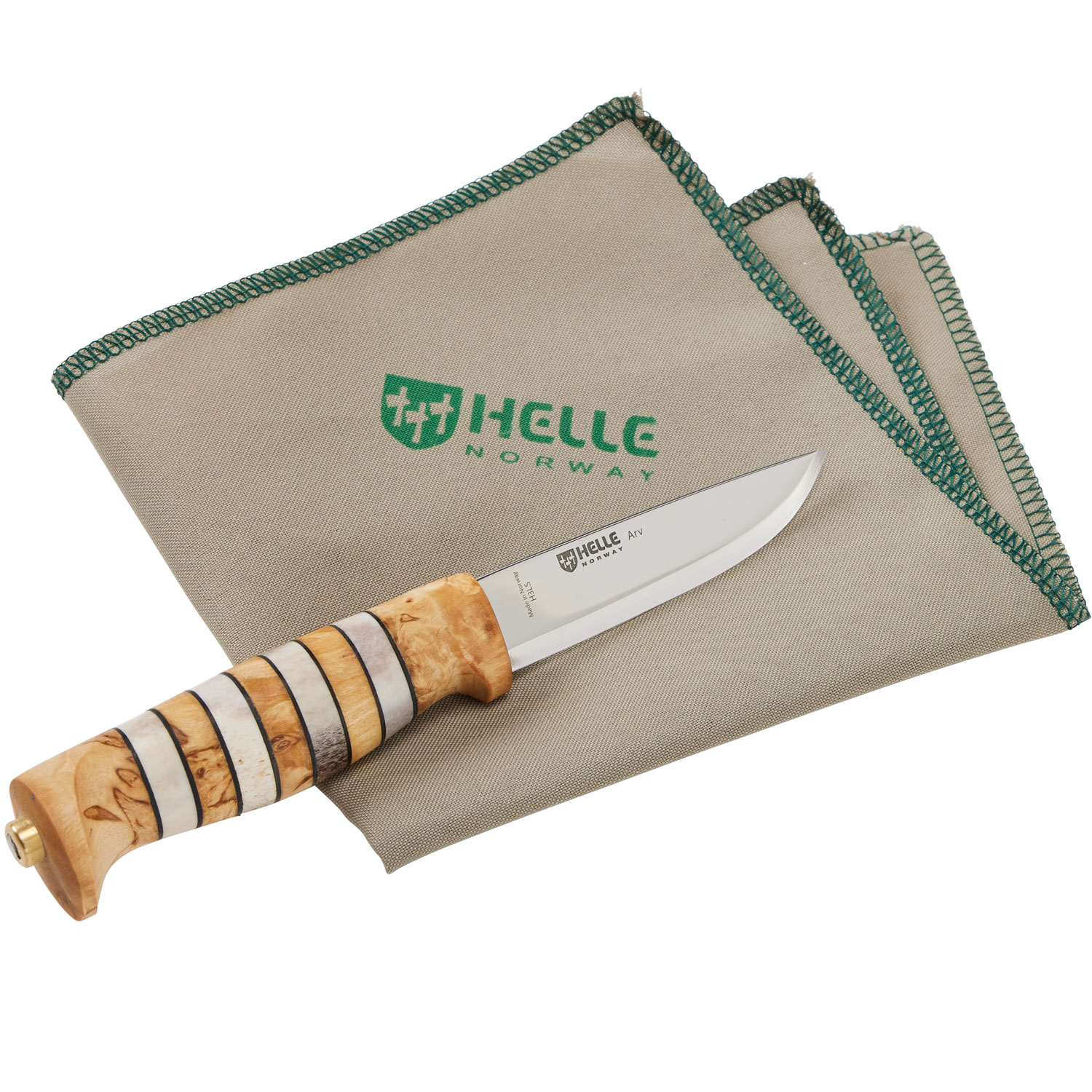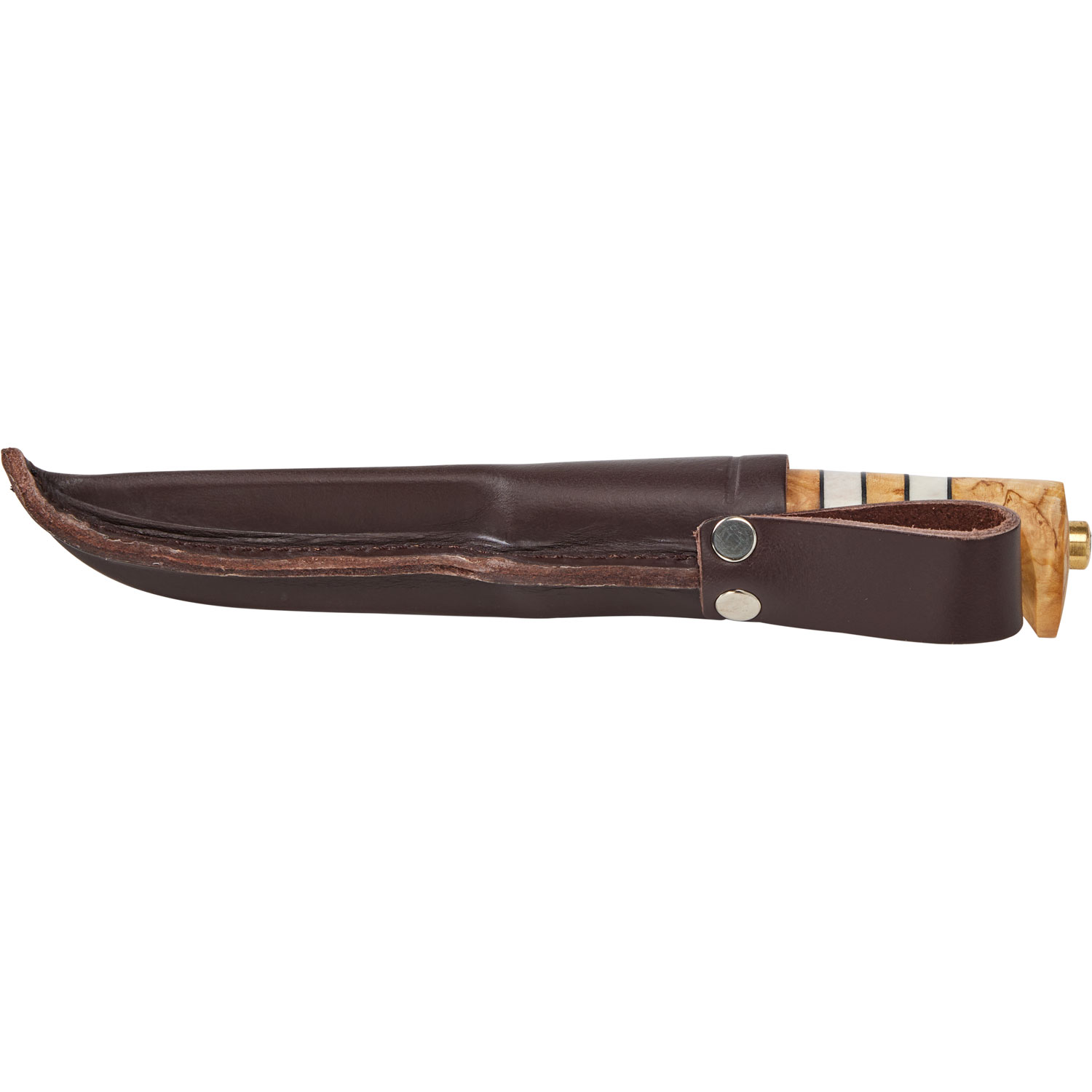 - Handmade grip crafted of stacked curly birch, leather and genuine staghorn