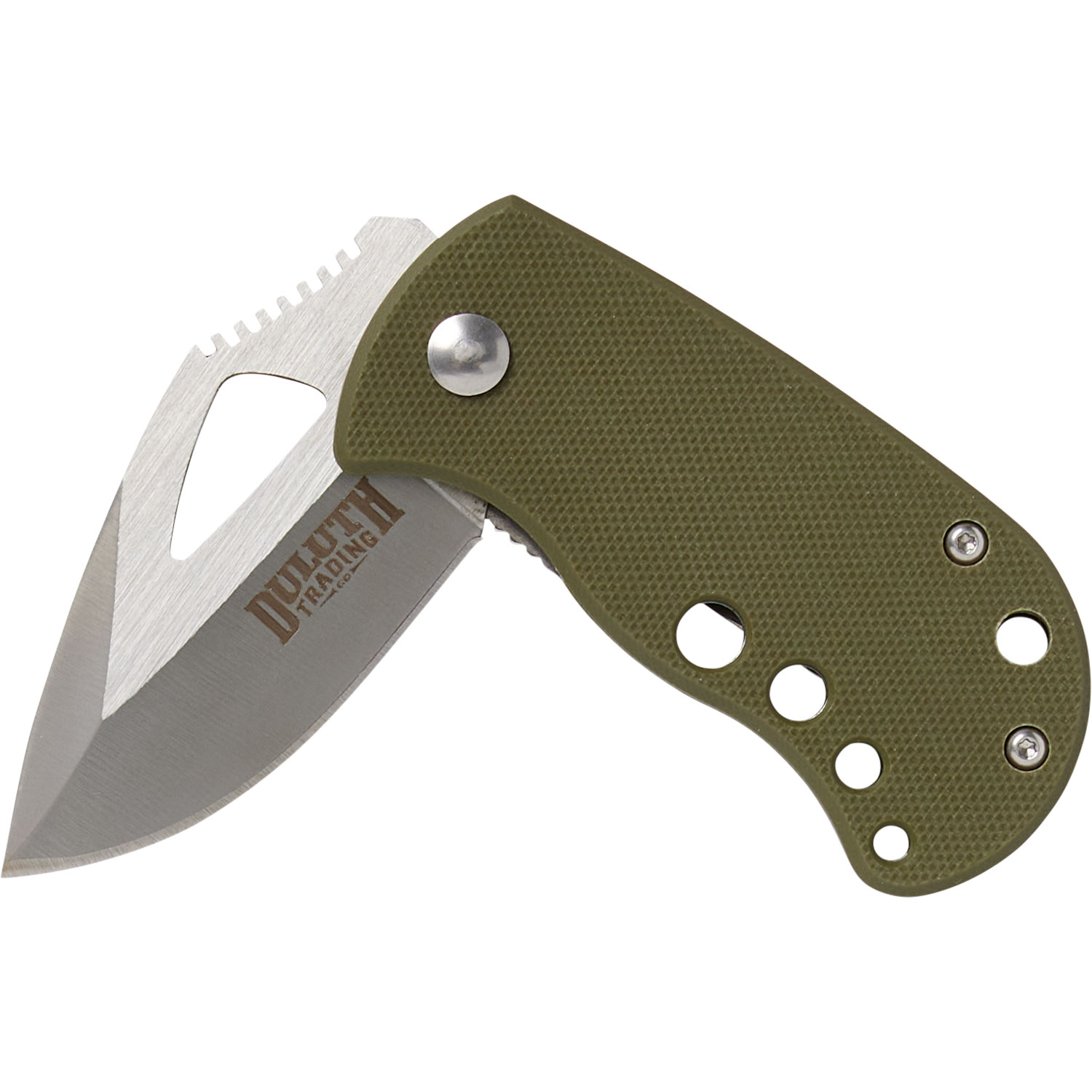 - Moistureproof, temperature-impervious G10 fatigue green handle with belt clip