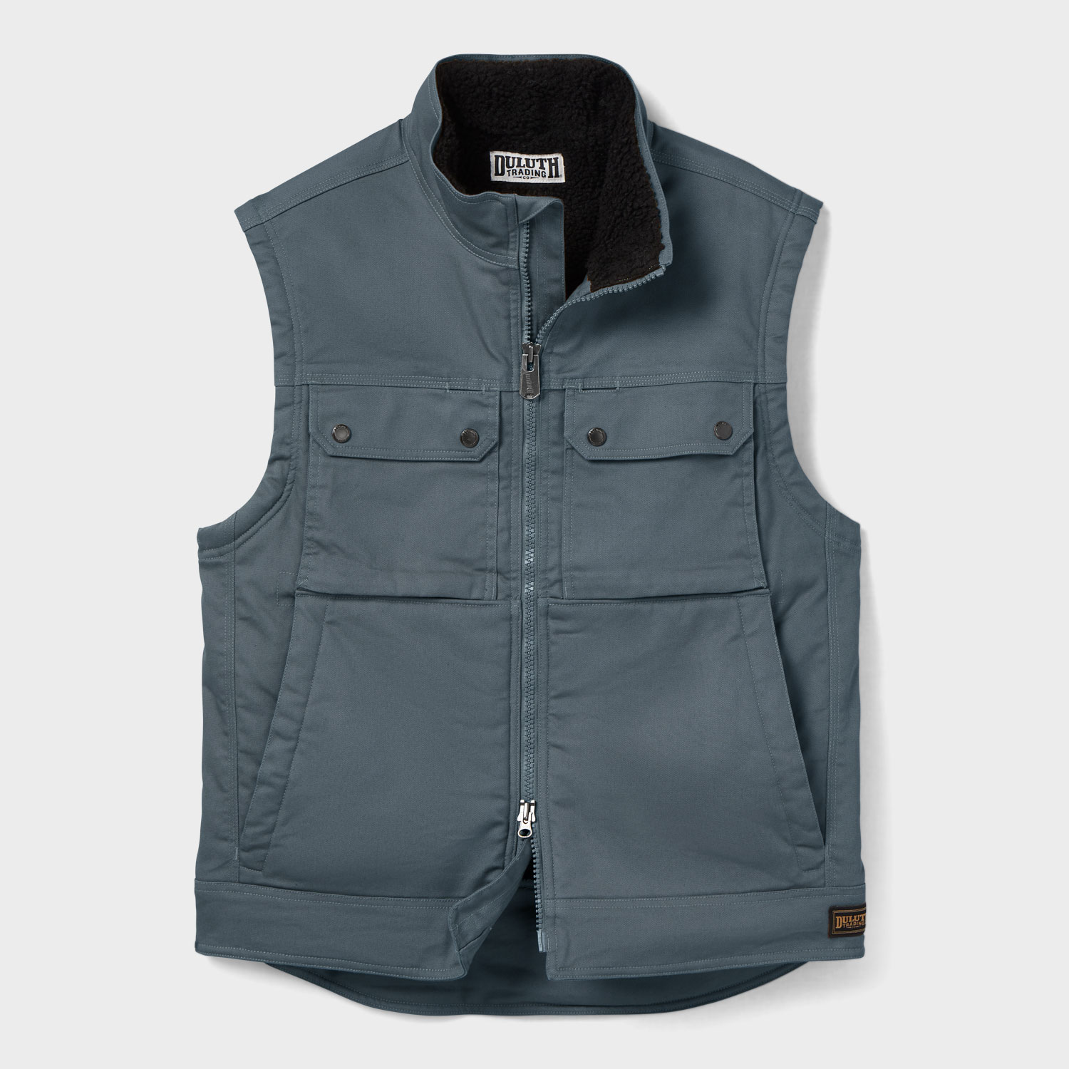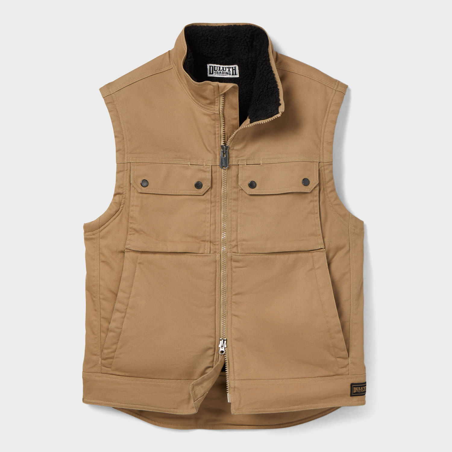 Our Fire Hose® canvas vests have earned legendary status among working men for their never-say-die durability. But now there’s an even tougher vest on the jobsite. It’s made of DuluthFlex® Fire Hose® HD – a high-tech wonder fabric that withstands abrasion 4X better than tried-and-true cotton work canvas. Better yet, it has more than double the tensile strength and rip resistance of highly durable original DuluthFlex Fire Hose fabric. Yet for all its ruggedness, DuluthFlex Fire Hose HD is remarkably wearable thanks to the work-friendly 10-oz. weight and remarkable built-in stretch. Triple-needle stitching resists rip-outs and a drop tail blocks drafts from blowing up your back. A cushy sherpa lining keeps you warm when the mercury tumbles. 9 pockets offer ample storage for phone, pencils, gloves, notepad and much more. Order yours up today and tear through your punch list, not your vest.