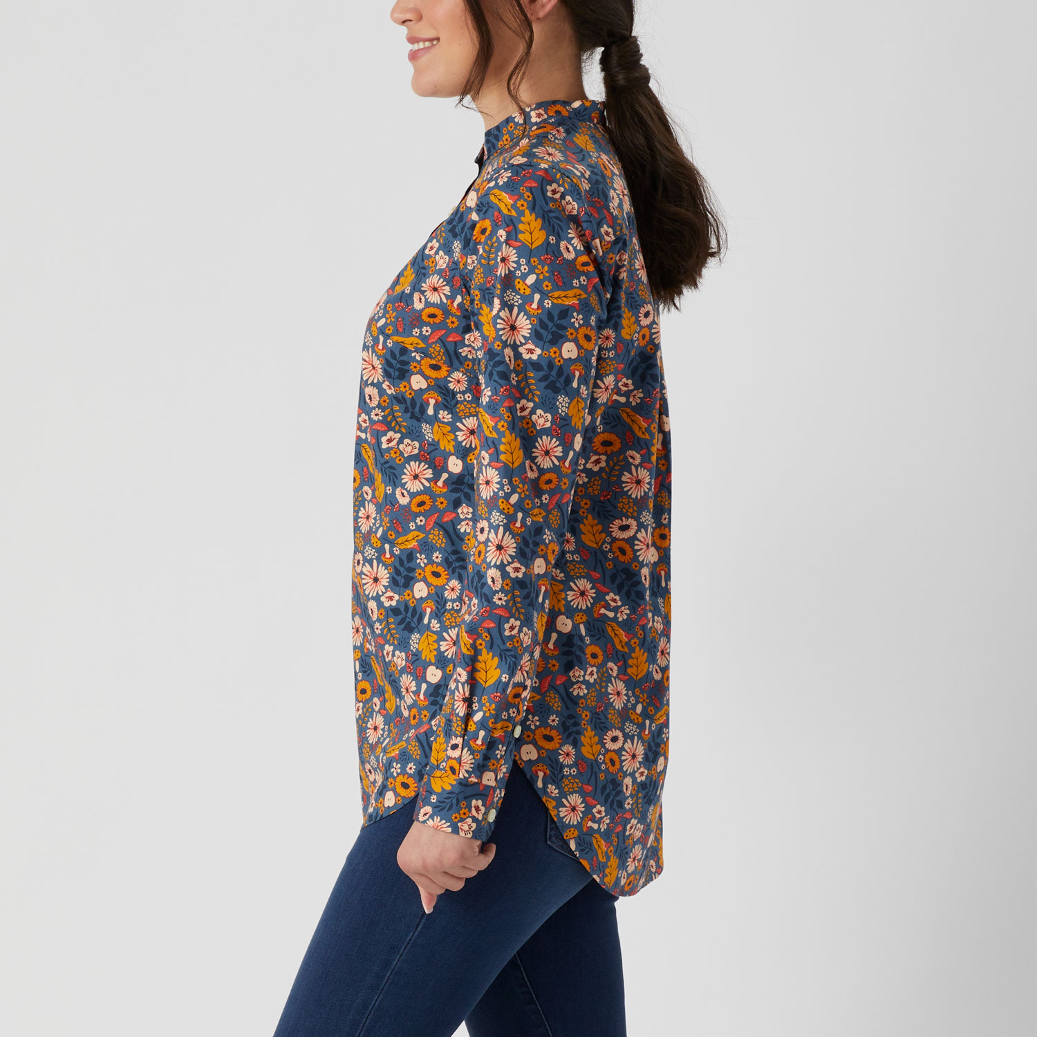 - Tunic length with a high/low hem that lends extra coverage as you bend