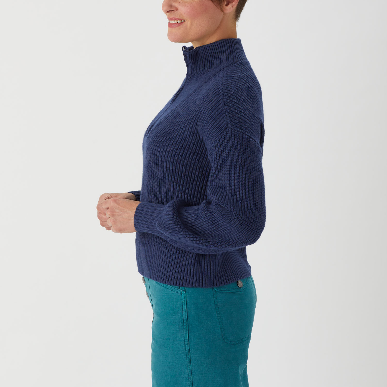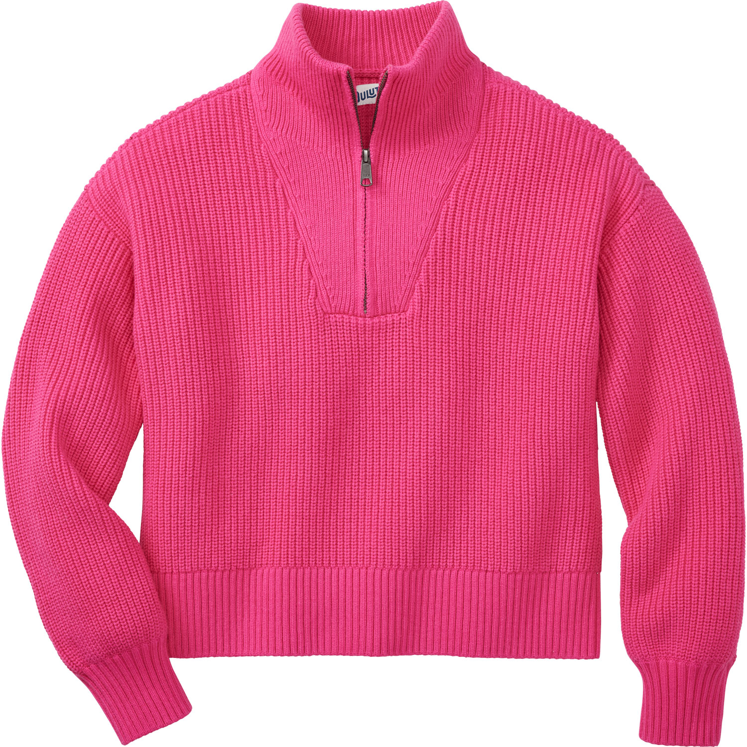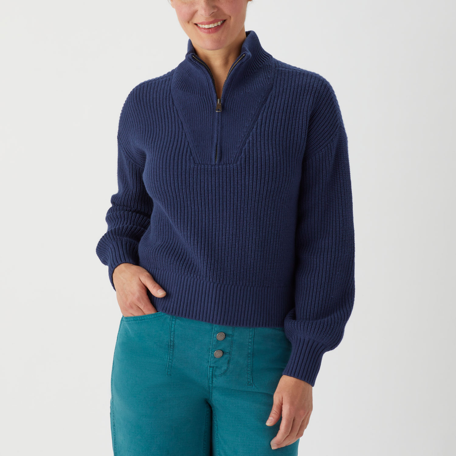 - Quarter-zip neck with 1x1 rib collar stands at attention