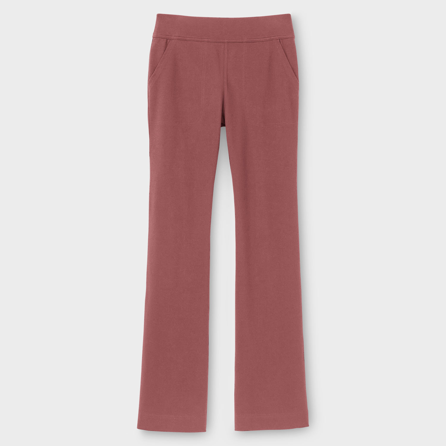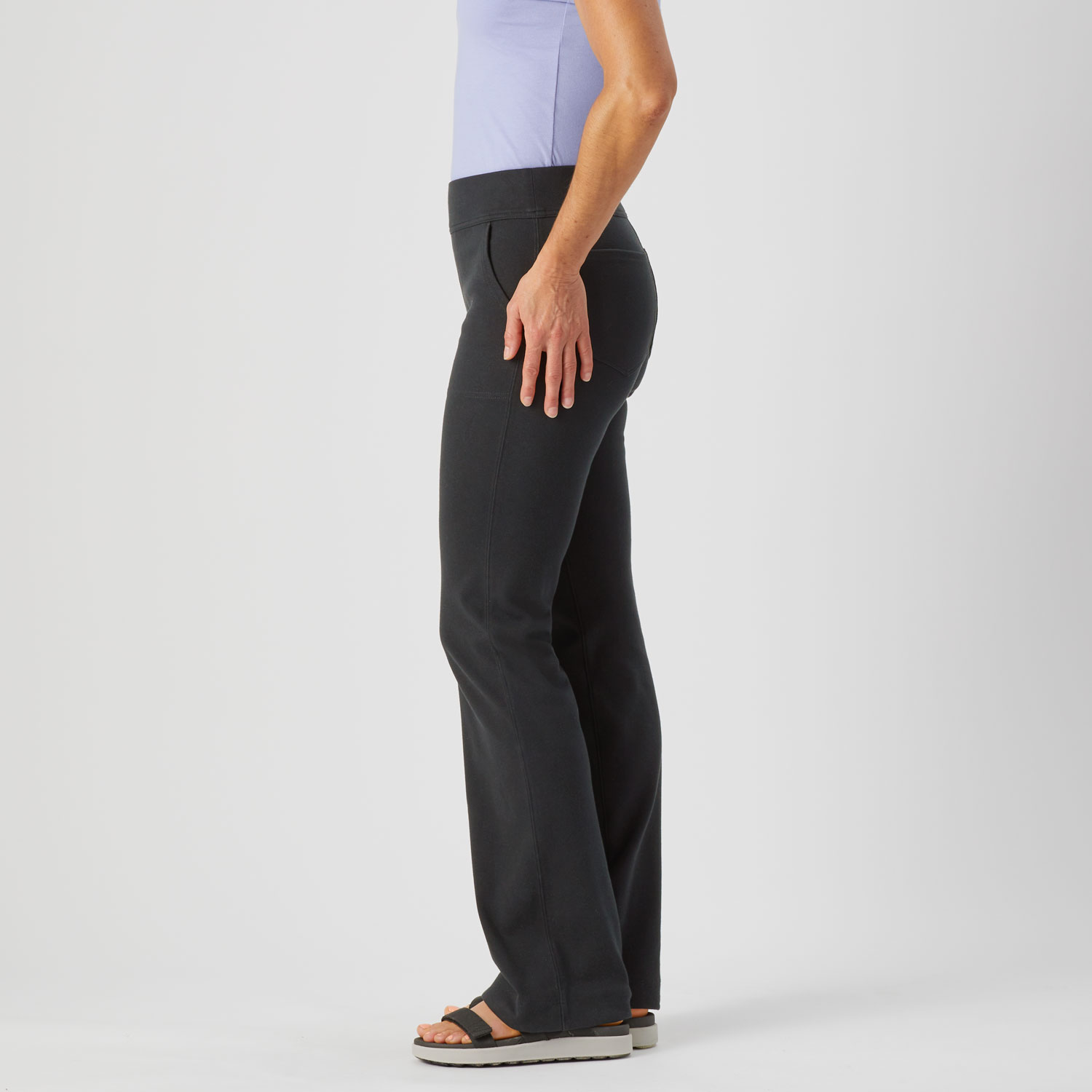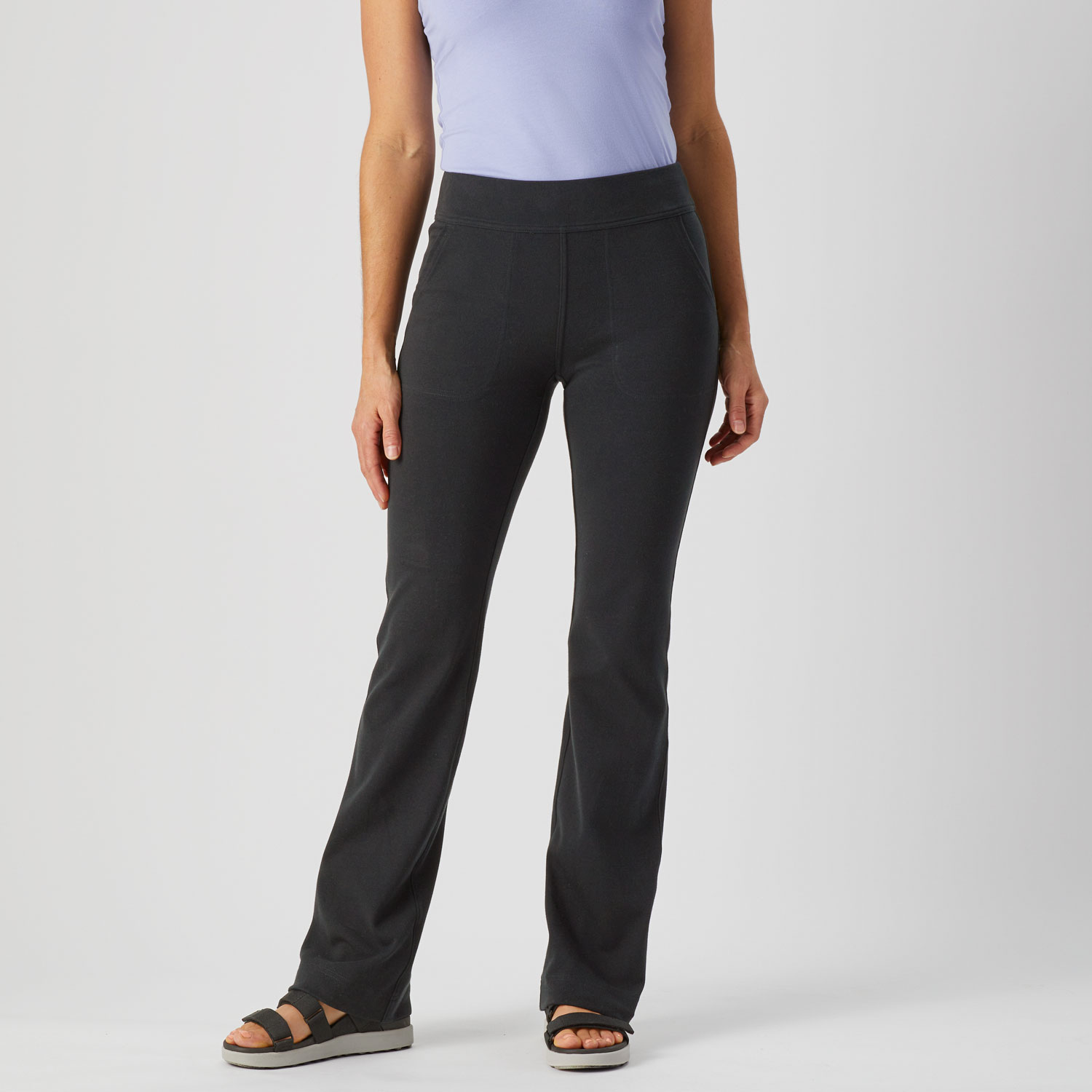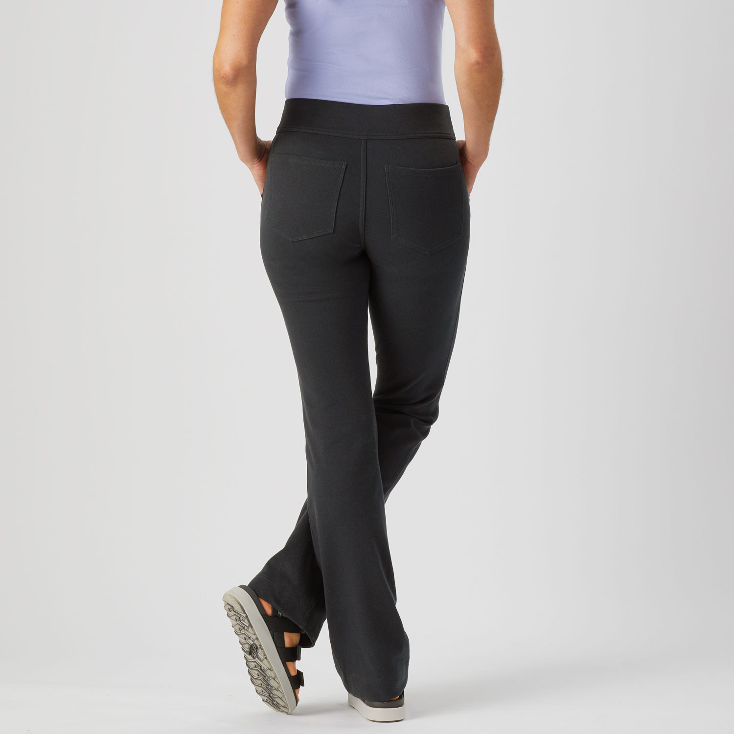 • High rise sits above waist with trim hip and thigh; bootcut leg