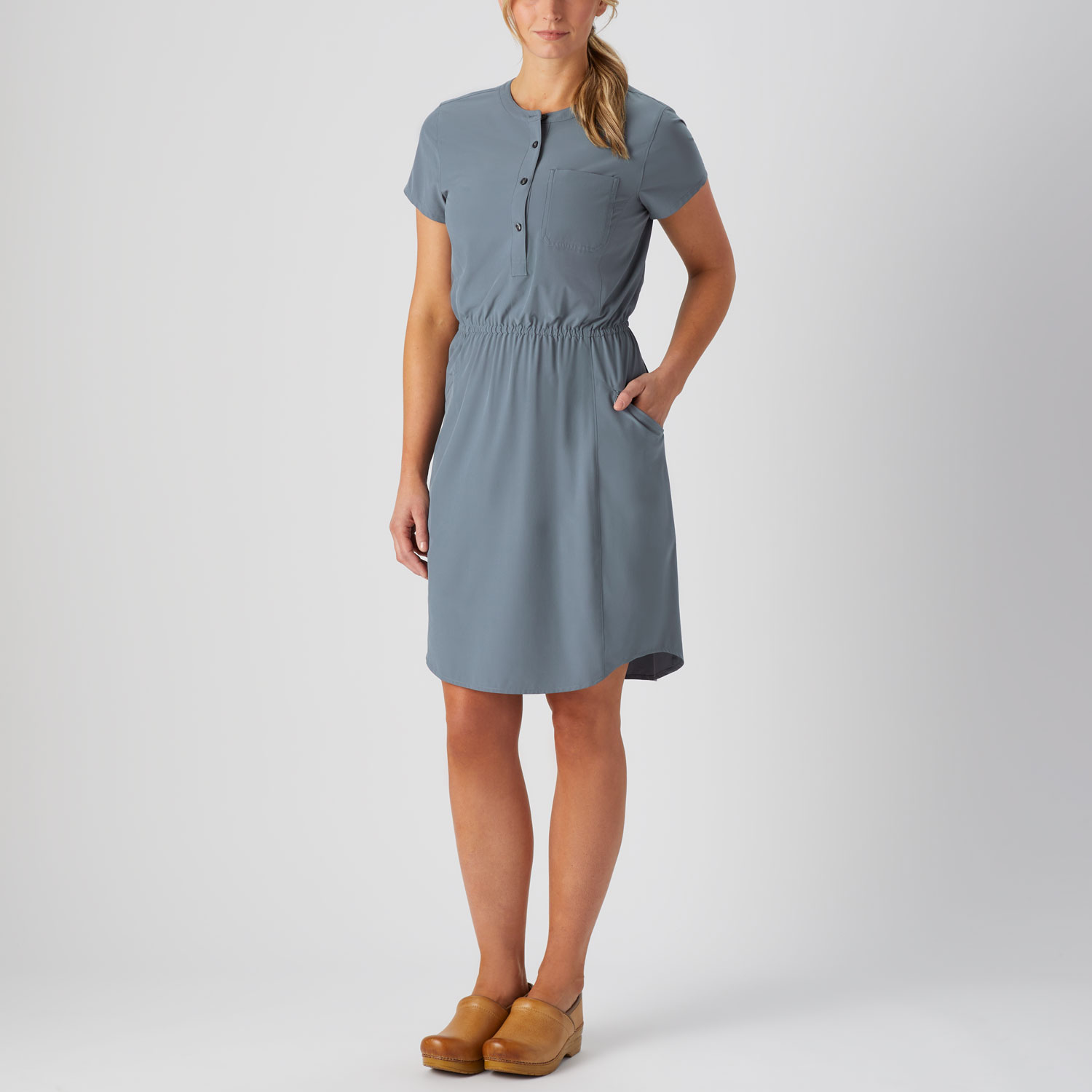 Introducing the Nine to Fine Synthetic Cap Sleeve Dress – our newest one-piece wonder! Made from recycled polyester with a healthy shot of 4-way stretch, it’s a stylish and practical addition to your professional wardrobe. It’s imbued with an odor-fighting, anti-microbial and wicking finish, so you can rest assured no one will see you sweat the small stuff. A handsome henley-style neckline lets you button up or down to your liking. And with its 3 low-profile pockets, there’s plenty of room to stash office essentials. There’s even UPF 50+ sun protection baked right in! With so much functionality, this durably drapey dress is sure to become an instant classic in your closet.