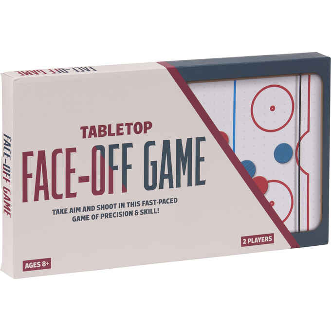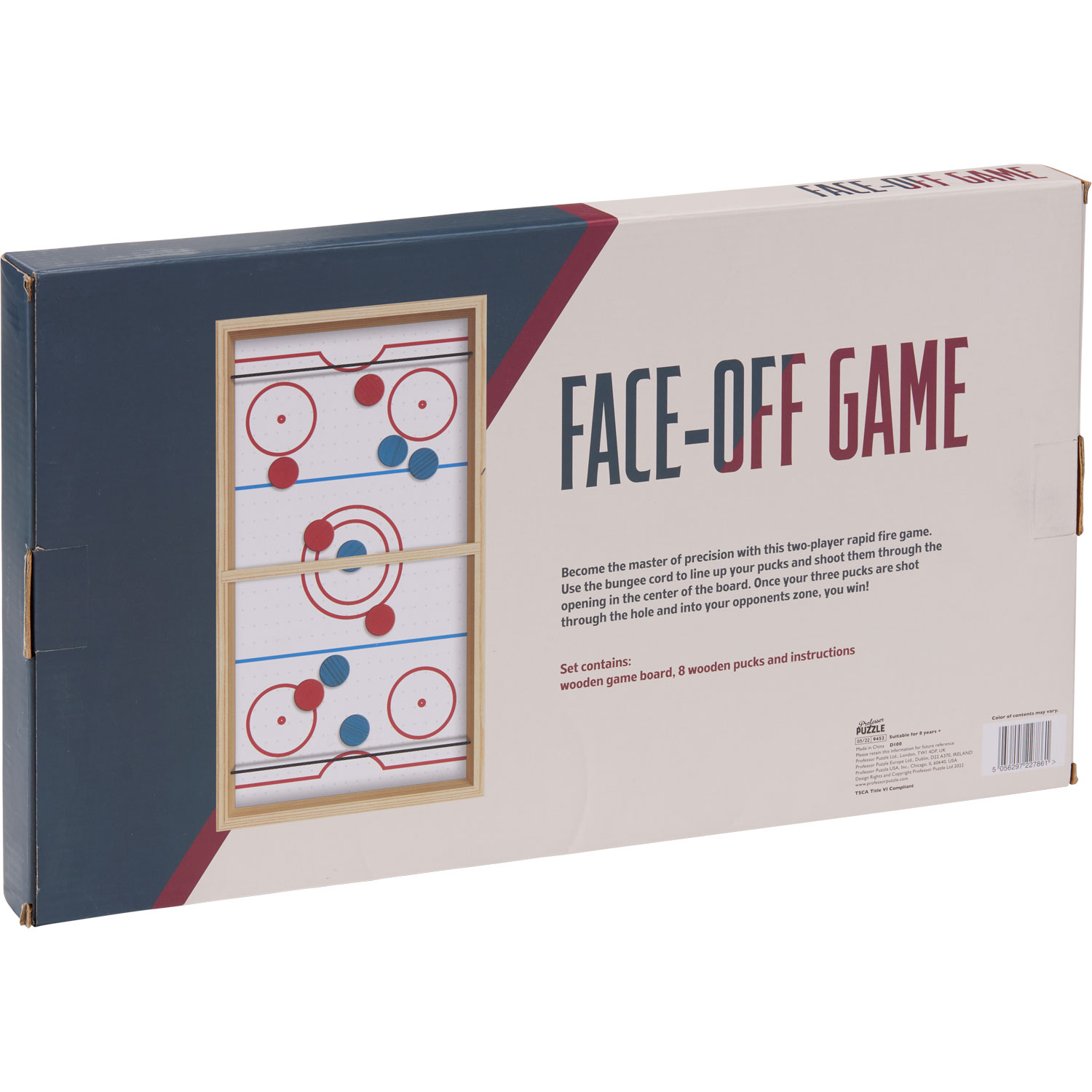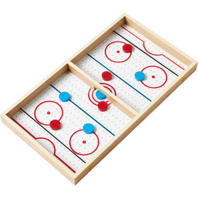- Lob pucks at your opponent with the bungee launcher; first player to shoot all his pucks through the slot wins