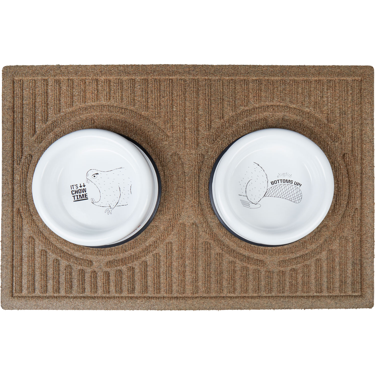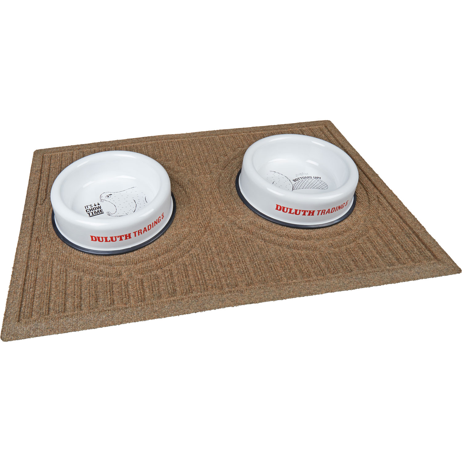 - USA-made double-bowl mat protects floors from your canine’s messy dining habits