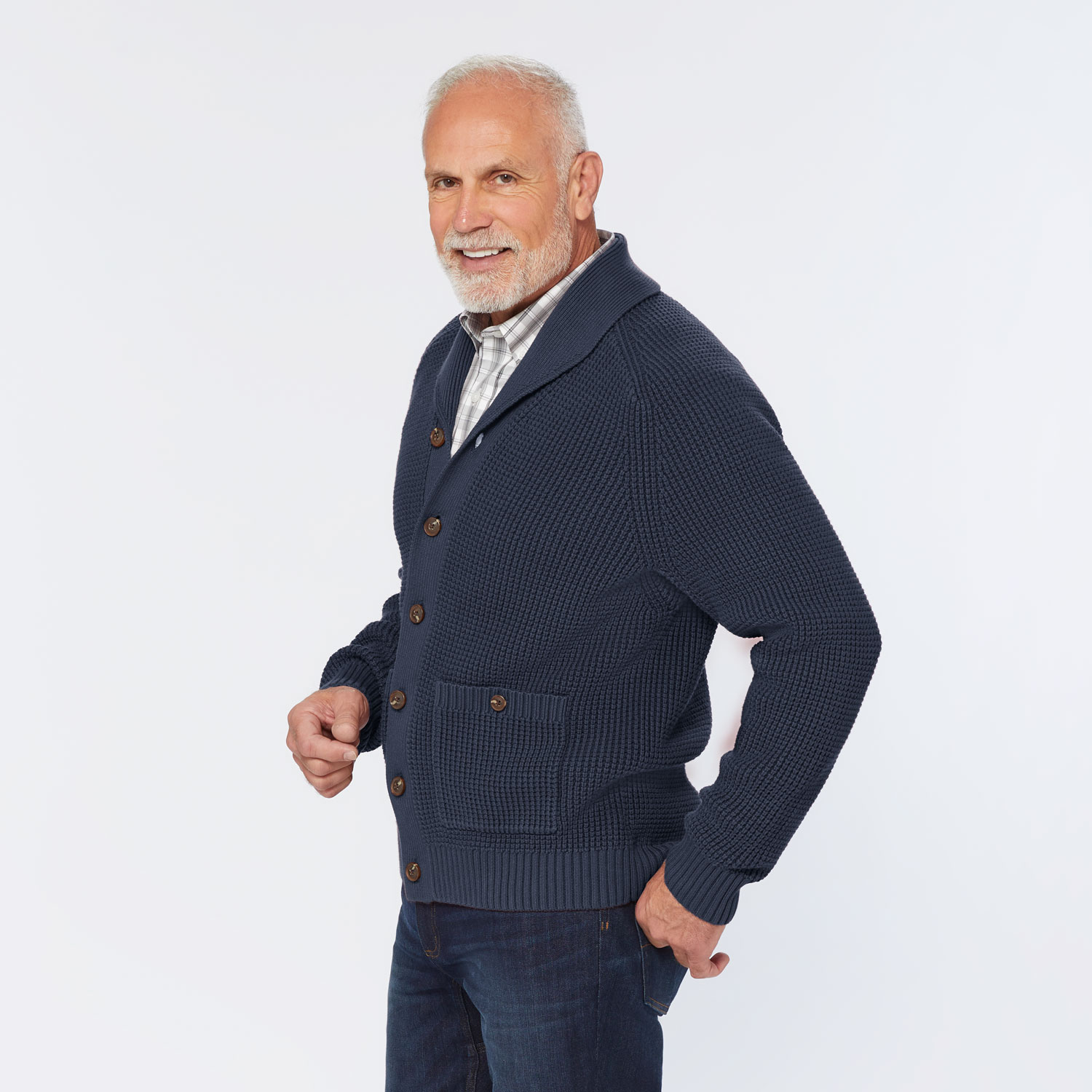 Even though you’re still punching the clock, you don’t have to wait to feel like you’re on easy street. Put on this hefty shawl collar cardigan and you can retire “burly” right now – to your favorite easy chair to relax in the effortless warmth of the heavy-gauge cotton-rich waffle knit. Layer it over a turtleneck or tee at home, or slip it on over a Wrinklefighter woven shirt when you’re dressing to impress. Ribbed collar, hem and cuffs keep this modern classic in shape. And if you happen to actually BE retired, Reach Gussets® make sure you’ve got room to relax – or stay active if you wish.