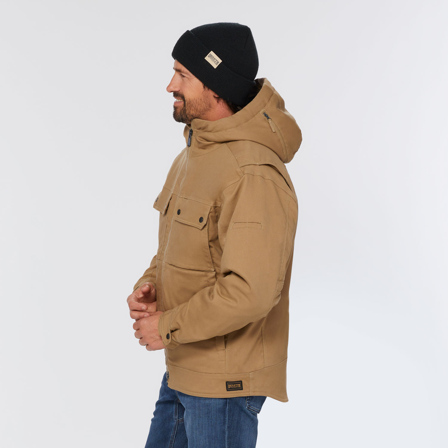 Our Fire Hose® canvas jackets have earned legendary status among working men for their never-say-die durability. But now there’s an even more rugged jacket on the jobsite. It’s made of DuluthFlex® Fire Hose® HD – a high-tech wonder fabric that withstands abrasion 4X better than tried-and-true cotton work canvas. Better yet, it has more than double the tensile strength and rip resistance of highly durable original DuluthFlex Fire Hose fabric. Yet for all its ruggedness, DuluthFlex Fire Hose HD is remarkably wearable thanks to the work-friendly 10-oz. weight and remarkable built-in stretch. A cushy sherpa lining keeps you warm when the mercury tumbles. The bi-swing back, articulated elbows and Reach Gussets® give you the freedom to grapple with big jobs. An expandable hood fits easily over your hard hat. And 11 pockets give you ample storage for phone, pencils, gloves, notepad and much more. Order up yours today and tear through your punch list, not your jacket.
