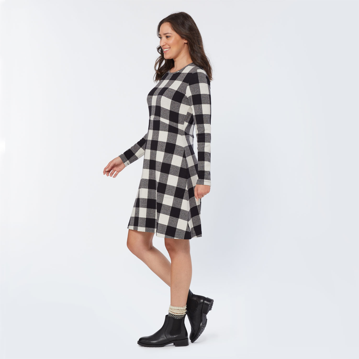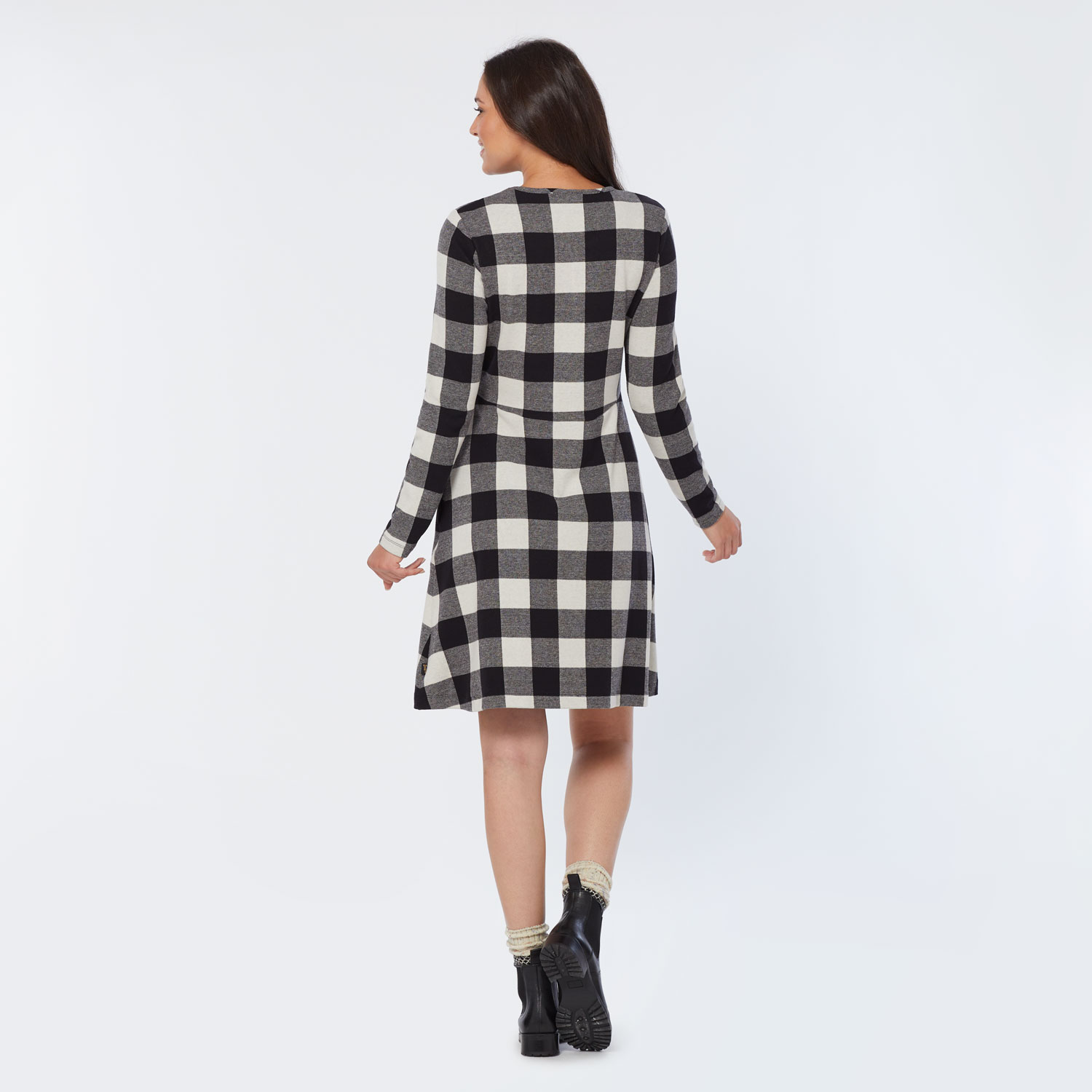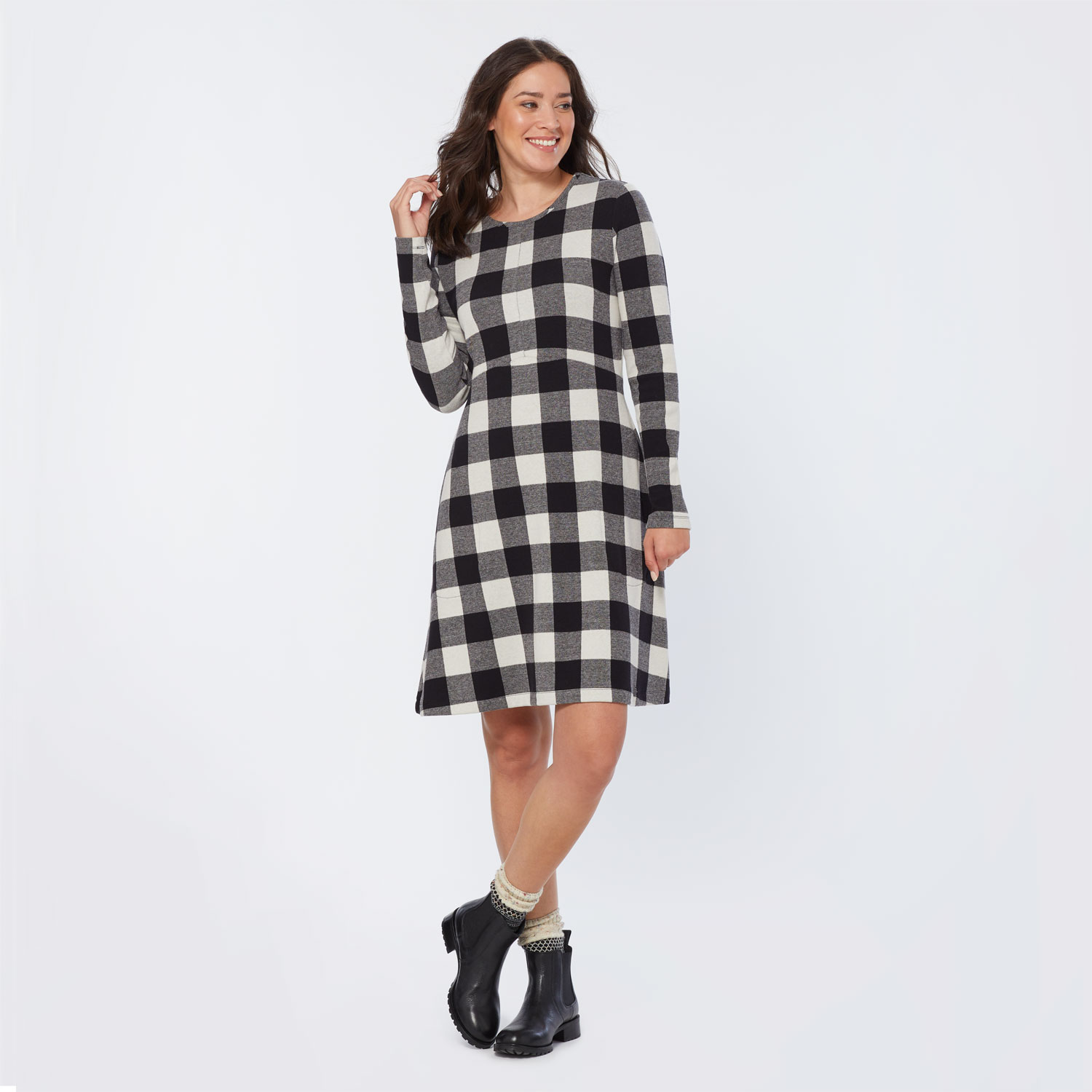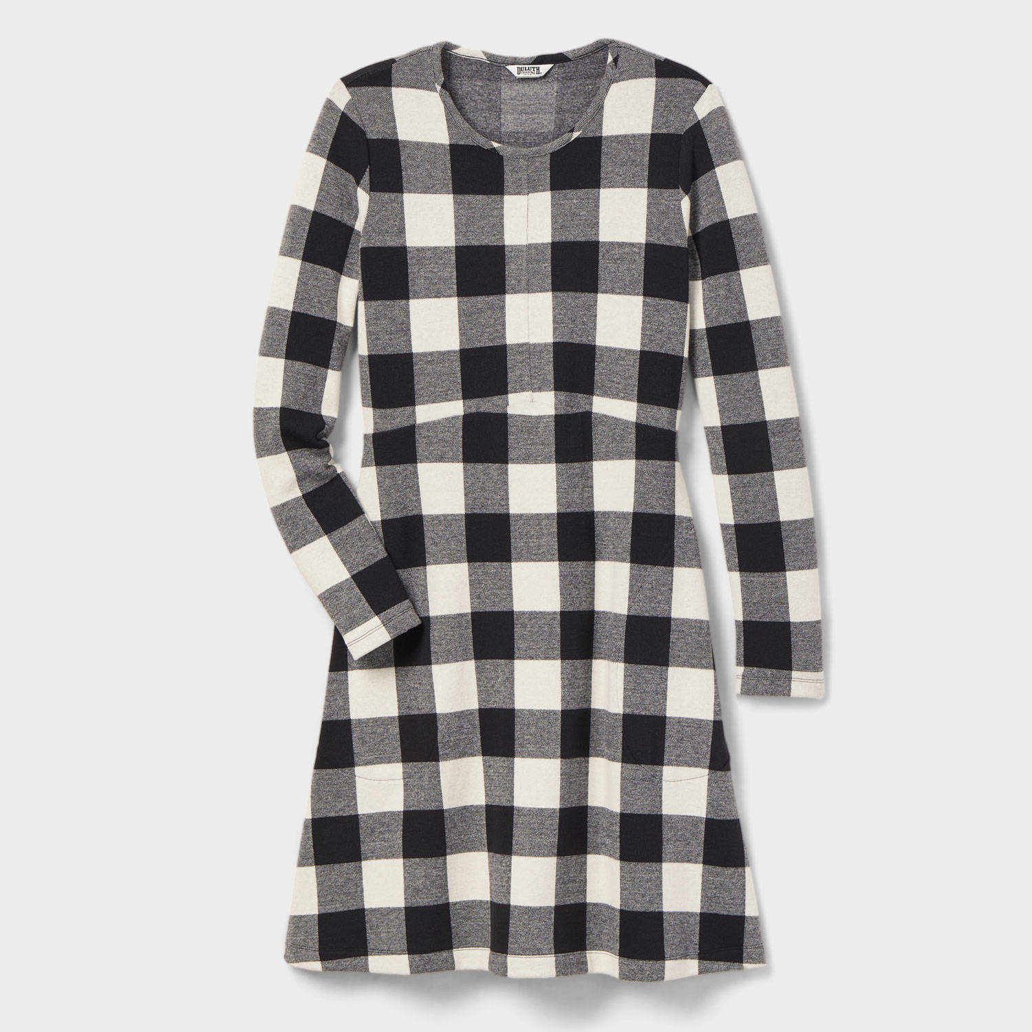 It’s hard to imagine a fabric more comfortable than classic flannel – but by gum, we’ve done it! Soft knit t-shirt fabric looks just like woven flannel, in traditional plaid that’s brushed to perfection. The T-Shirt Flannel Dress’s stretchy construction hugs your curves in all the right places and allows for freedom of movement just not found in woven fabrics. And of course, there are pockets – 2 on-seam hand pockets cut deep and wide for cards, keys and cash. Layer up over leggings or go it alone. This long-sleeved dress is a one-and-done style solution you’ll reach for all season!