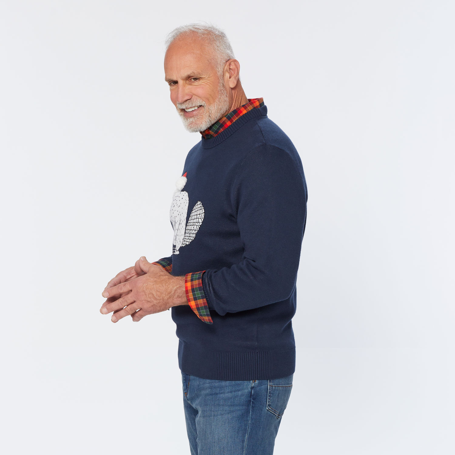 • Classic Fair Isle pattern with jacquard-knit Angry Beaver in Santa cap