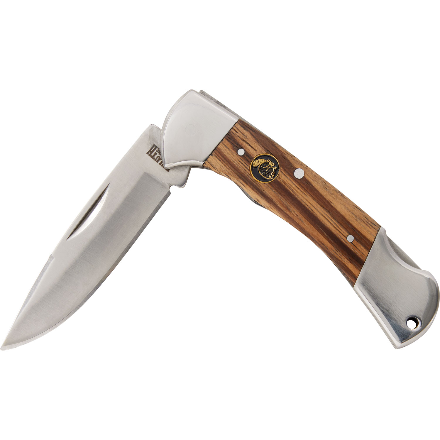 - Handsome zebrawood handle boasts an antiqued brass Angry Beaver emblem