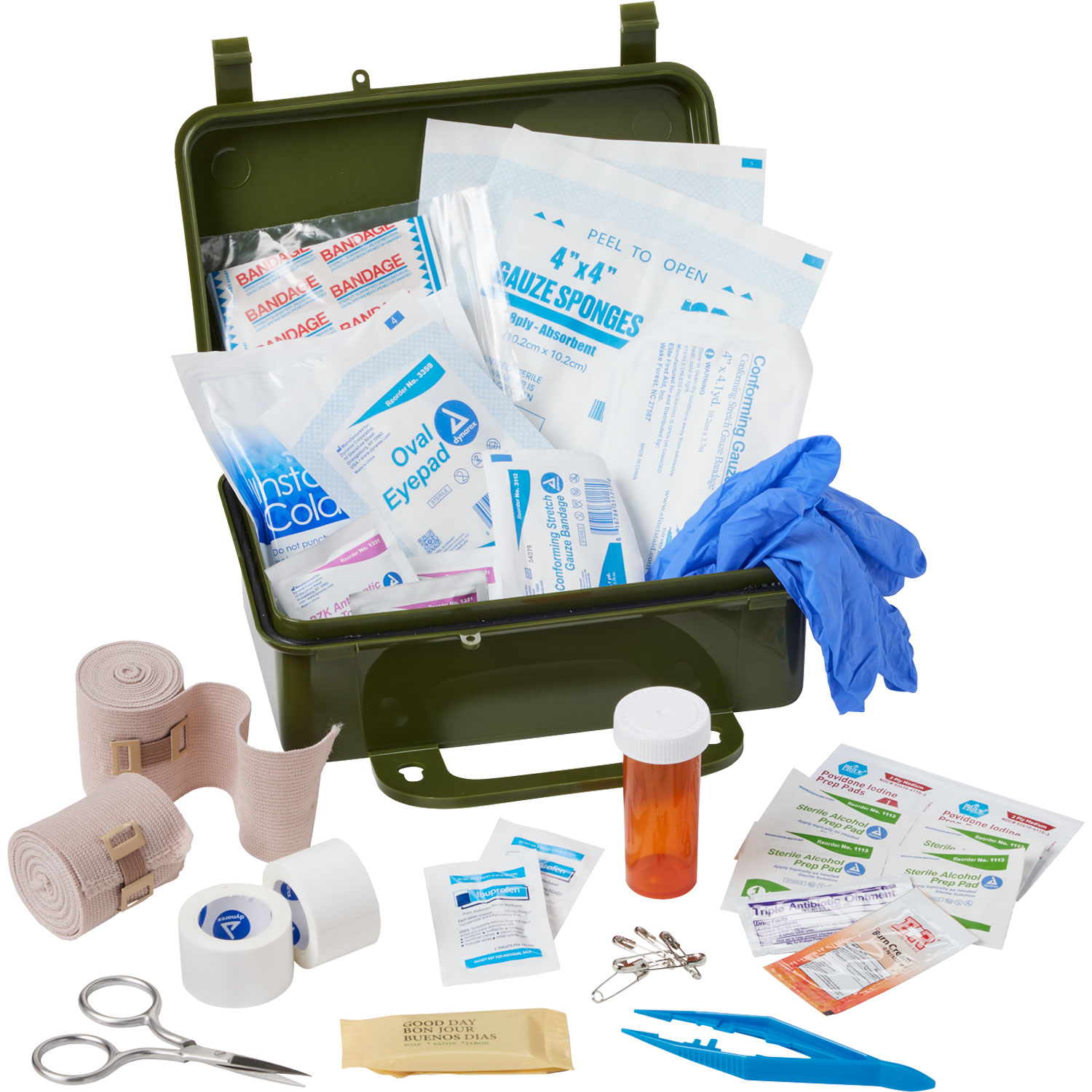 Packed with the same medical firepower as military-issue models, our Field First Aid Kit is waterproof, compact and tougher than boot camp drills. Yet it carries all the supplies needed to clean, disinfect, treat and protect the most common field mishaps. Contains a full complement of medical essentials, including an instant cold compress, nitrile gloves, iodine wipes, pain reliever tablets, gauze, tweezers, scissors, burn cream, eye pad, antibiotic ointment, suture clippers, bandage strips and more. Deploy the Field First Aid Kit in any emergency and get back in action in no time.