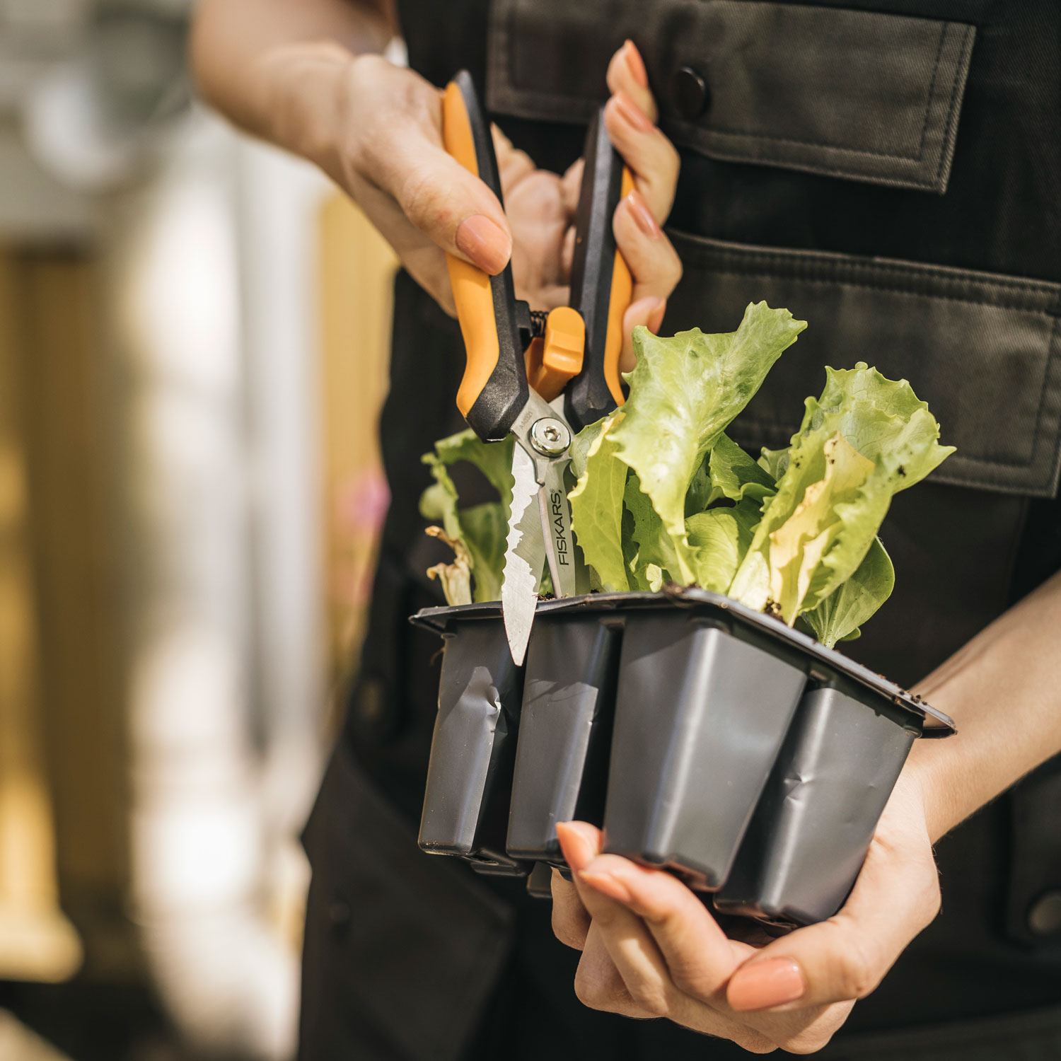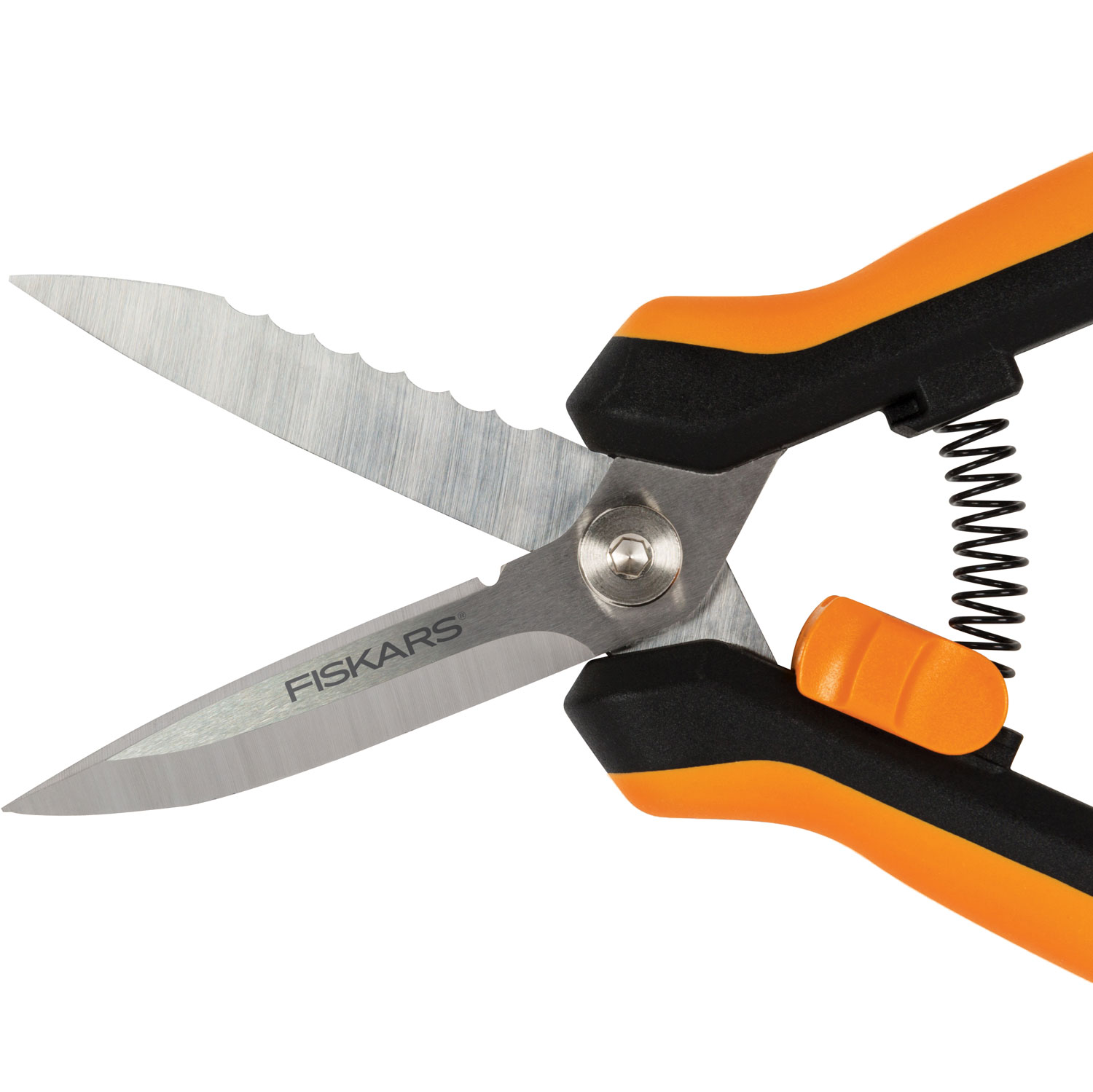 No more running back to the garden shed every time you need a different tool. The Fiskars® Multipurpose Garden Snips are compact and portable, yet tackle endless garden tasks you wouldn’t expect an implement this size to do. The fully hardened, precision-ground stainless steel blades cut all the way to the tip and stay sharp through arduous use – perfect for trimming delicate plants, snipping suckers or deadheading. One blade features an outer serrated edge that makes quick work of sawing twine or light rope, while the other blade has an outer straight edge that slices open soil bags and cuts landscape fabric. There’s even a wire cutter that’ll come in handy for building plant supports and cages. Best of all, the Softgrip® touchpoints and spring-loaded handles improve control as they fight fatigue. Includes sheath with belt loop.