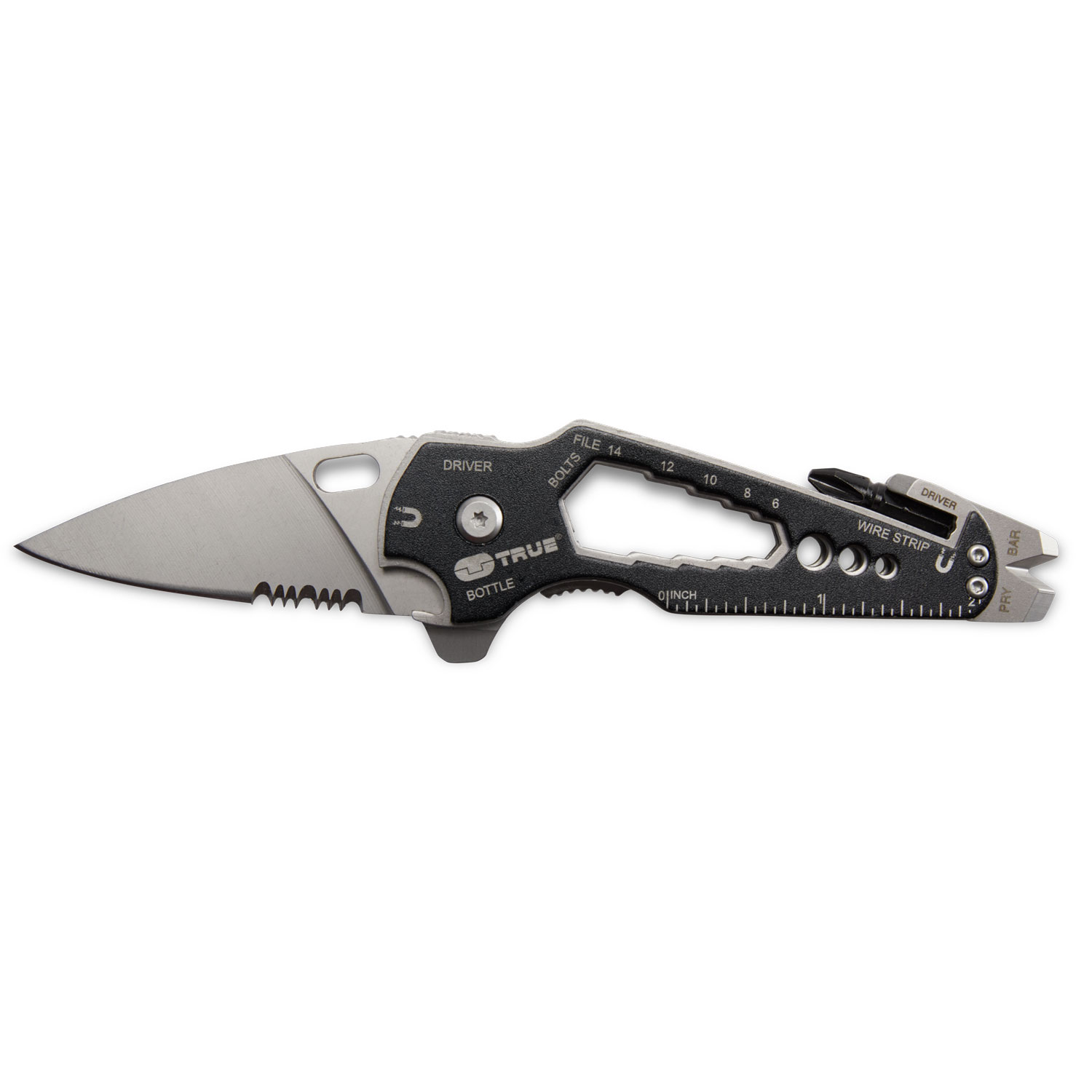 - Includes pry bar, bottle opener, screwdrivers, wire stripper, rulers, file, five metric wrenches and 1/4” magnetic bit storage