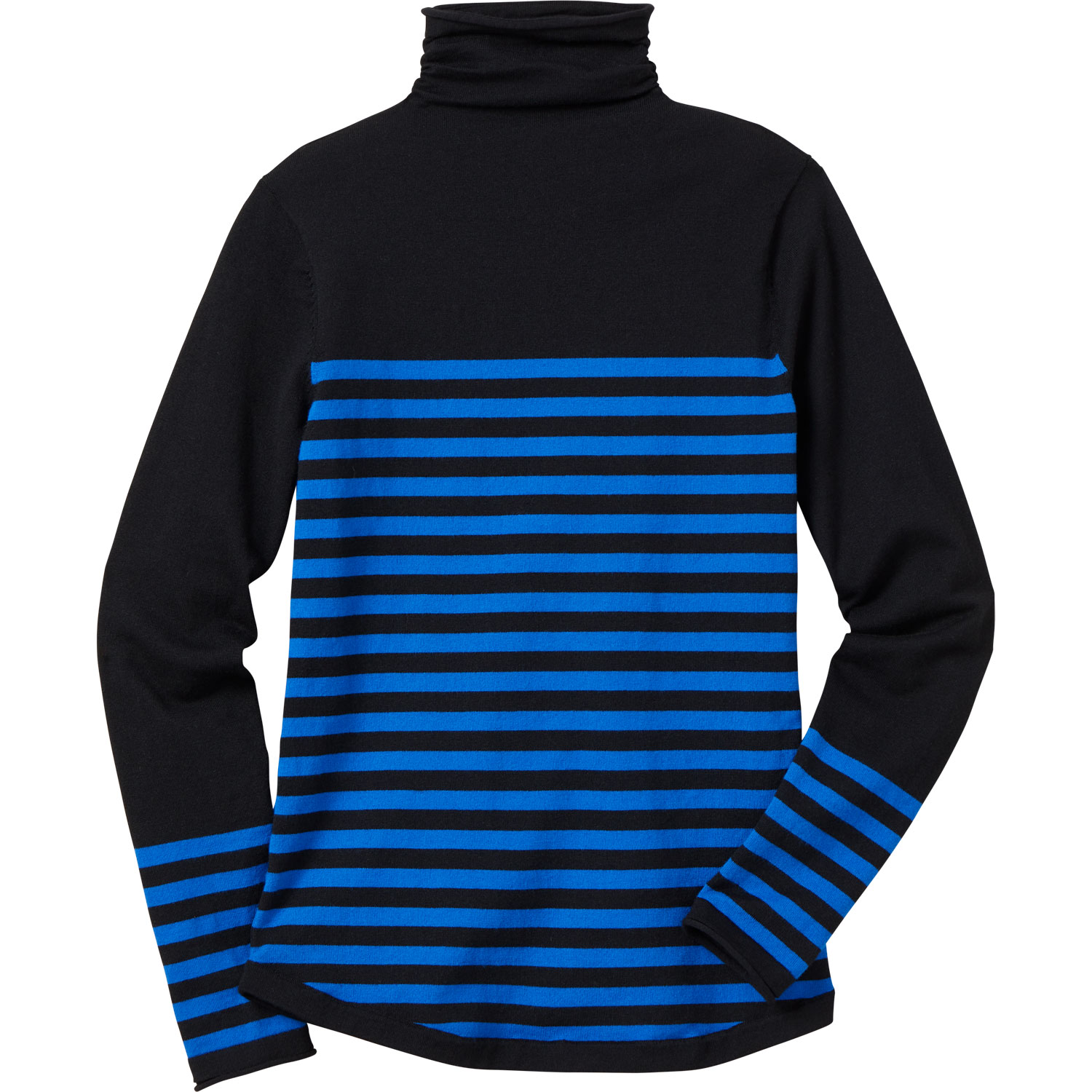 - Gathered turtleneck offers chin-deep coziness without constricting